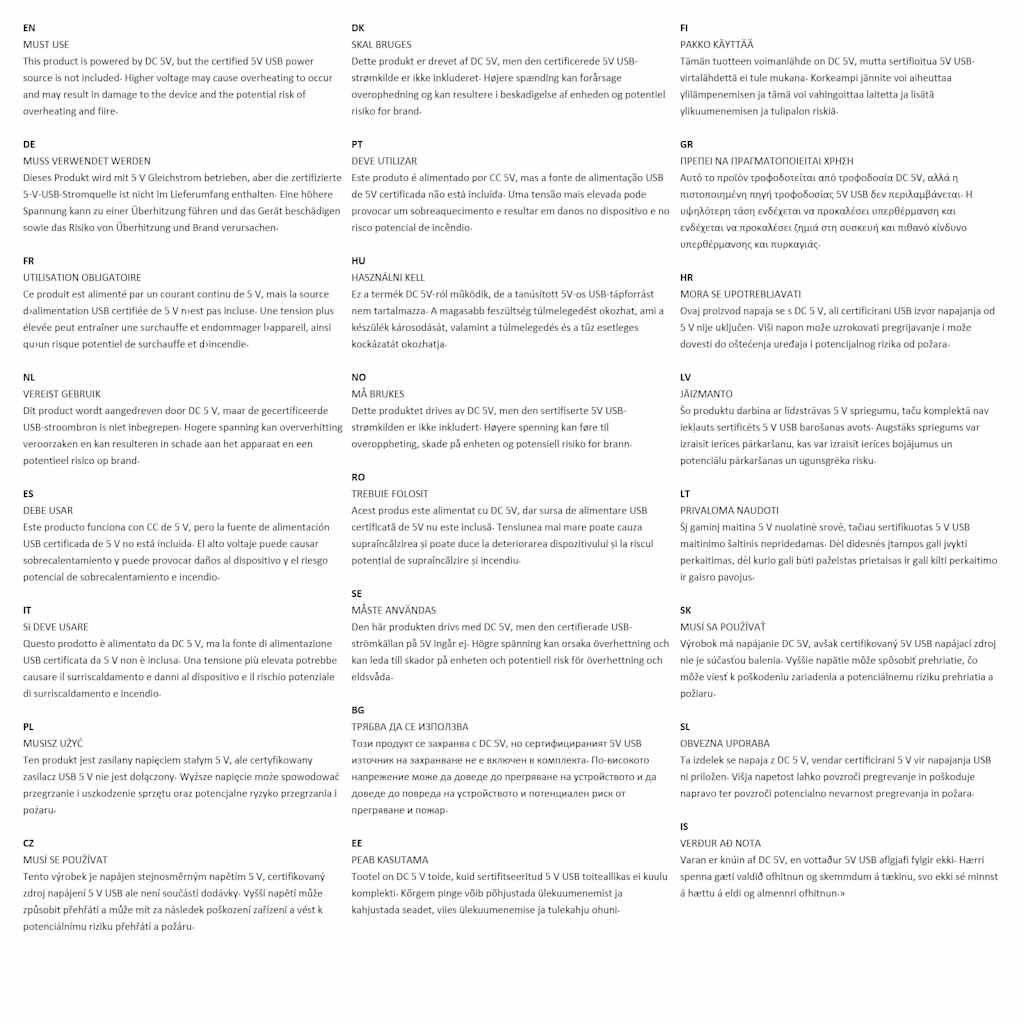 OBVEZNA UPORABA Ta izdelek se napaja z DC 5 V, vendar certificirani 5 V vir napajanja USB ni priložen. Višja napetost lahko povzroči pregrevanje in poškoduje napravo ter povzroči potencialno nevarnost pregrevanja in požara.