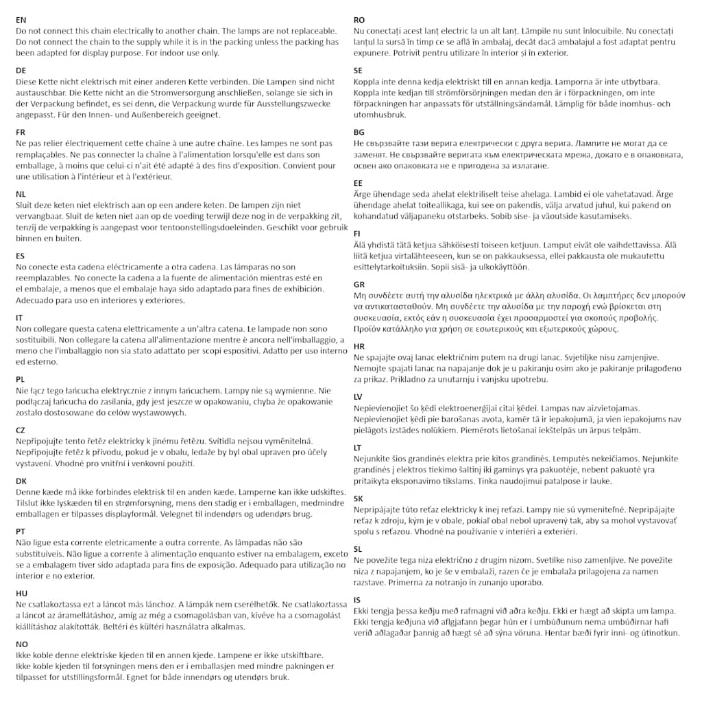 Ne povežite tega niza električno z drugim nizom. Svetilke niso zamenljive. Ne povežite niza z napajanjem, ko je še v embalaži, razen če je embalaža prilagojena za namen razstave. Primerna za notranjo in zunanjo uporabo.