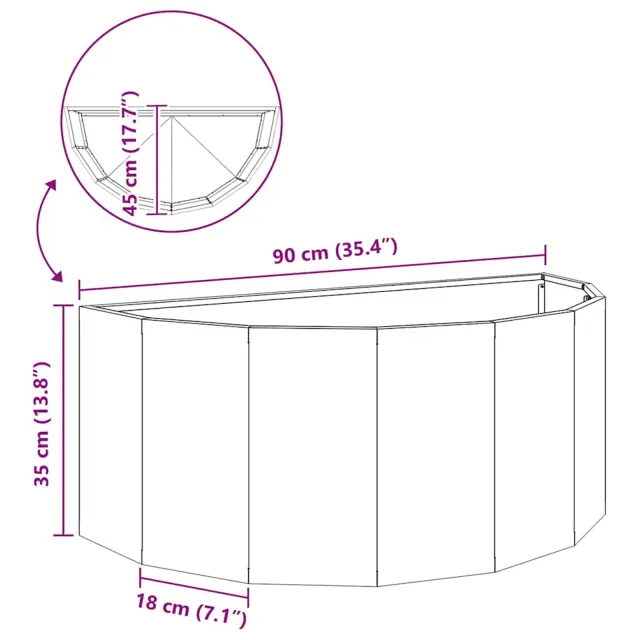 Ta elegantni vzdržljiv polkrožni grednik dvigne vaš zunanji prostor z moderno estetiko in robustno konstrukcijo. Zasnovan za zunanjo uporabo, ponuja stilno polkrožno obliko, ki prispeva k vsakemu vrtu ali terasi. Njegova trdna struktura iz kakovostnega jekla zagotavlja, da bodo vaše rastline dolgotrajno lepe. Ta grednik izboljša zunanje prostore in nudi možnosti za kreativno oblikovanje z različnimi slogi sajenja.
