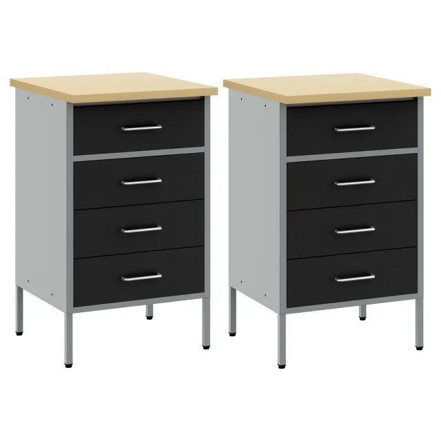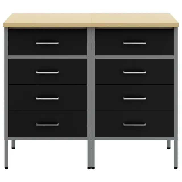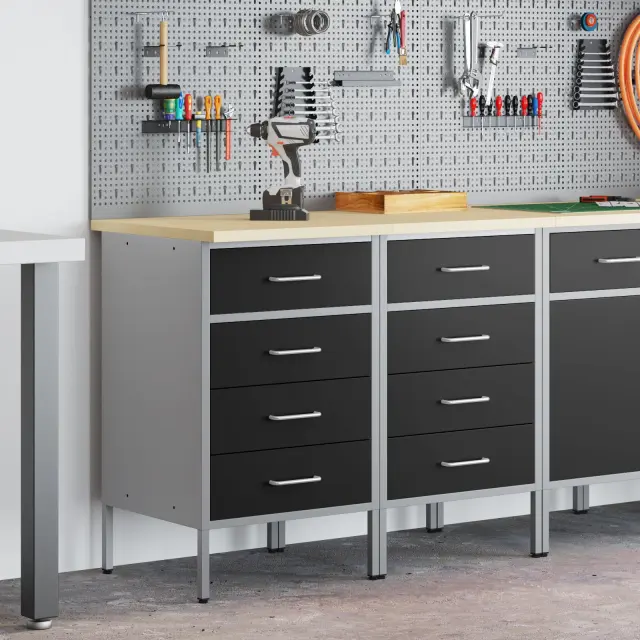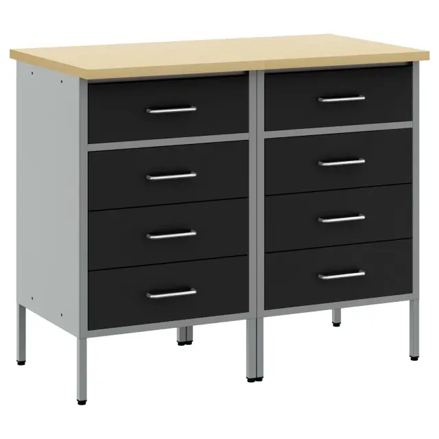 Ta industrijski jekleni delovni kabinet nudi močno shranjevanje za tvojo garažo in delavnico s stilskim pridihom. Narejen je za zahtevne naloge, z jeklenim okvirjem in inženirskim lesenim vrhom, kar daje trpežnost in sodoben videz.