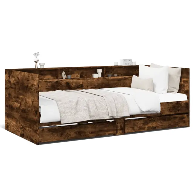 Ta dnevna postelja 2 v 1 s predali, ki služi kot kavč in postelja, je praktičen in privlačen dodatek za vašo dnevno sobo ali spalnico. Vsestranska dnevna postelja: Raztegljiv kavč čez dan deluje kot kavč, ponoči pa se spremeni v posteljo, kar je priročna rešitev za sprejemanje gostov. Veliko prostora za shranjevanje: Ta postelja za goste ima 2 predala s kolesi, ki zagotavljata dovolj prostora za shranjevanje oblačil, nogavic, igrač, blazin itd.Trdna konstrukcija: Ta dnevna postelja ima trpežen okvir iz inženirskega lesa. Inženirski les se ponaša z izjemno kakovostjo, gladko površino ter močjo, stabilnostjo in odpornostjo na vlago. Dobro je vedeti:Paket vsebuje samo okvir postelje. Vzmetnica ni priložena. V naši trgovini si lahko ogledate ustrezne vzmetnice.Barva: Dimljeni hrastMaterial: Inženirski lesCelotne dimenzije: 203 x 101,5 x 73 cm (D x Š x V) Velikost primerne vzmetnice: 90 x 200 cm (Š x D) (vzmetnica ni priložena)Višina prostora pod posteljo: 18,5 cmDimenzije predala (vsak): 93,5 x 31,5 x 14,5 cm (D x Š x V)Potrebno sestavljanje: DaPaket vsebuje:1 x Dnevna postelja2 x Posteljni predal 3280850