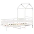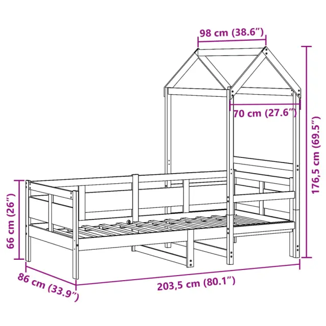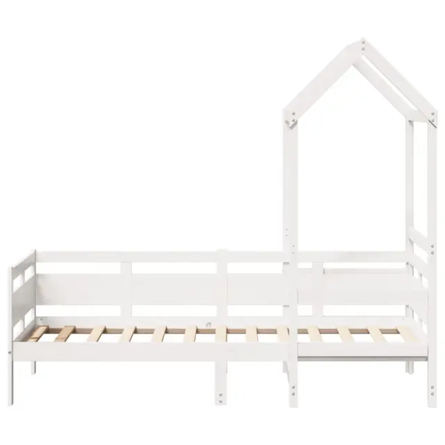 To vsestransko leseno dnevno posteljo lahko uporabljate kot posteljo v spalnici ali pa kot kavč v dnevni sobi. Zadovoljila bo vse vaše potrebe in vam zagotovita dovolj prostora za spanje ter počitek. Trdna borovina: Trdna borovina je čudovit naravni material. Borovina ima ravne vzorce, grče pa dajejo materialu njegov značilen, rustikalen videz.3-stranska posteljna ograja: Stranice dnevne postelje se ponašajo z edinstvenim dizajnom, ki zagotavlja občutek varnosti in hkrati vašemu domu doda pridih prefinjenosti.Letven dizajn: Leseno letveno dno omogoča boljše kroženje zraka, zato bo vzmetnica dlje časa ostala sveža, ter izboljšuje nosilnost postelje in zagotavlja stabilnost.Dodaten prostor za shranjevanje: Prostor pod posteljo izkoristite za shranjevanje različnih stvari. To je popolno mesto za shranjevanje škatel z oblačili, igračami ali prešitimi odejami.Odlična zabava: S kombinacijo strehe in raztegljivega kavča lahko ustvarite skrivališče, ki vašemu otroku nudi veliko zabave pred spanjem. Ta inovativni dodatek ne bo le vznemirljiva osrednja točka, temveč bo v sobo vnesel tudi občudovanje in navdušenje.Odprta stranska vrata: Streha ima odprta stranska vrata, ki otrokom omogočajo enostaven dostop do postelje in iz nje. Dobro je vedeti:Vzmetnica ni priložena tej postelji. Ponujamo različno izbiro ležišč. V naši trgovini si lahko ogledate ustrezne vzmetnice.Potrebno sestavljanje: DaDnevna postelja:Barva: BelaMaterial: Trdna borovinaMaterial letvic: Vezan lesDimenzije: 203,5 x 86 x 66 cm (D x Š x V)Velikost primerne vzmetnice: 80 x 200 cm (Š x D) (vzmetnica ni priložena)Streha postelje:Barva: BelaMaterial: Trdna borovinaDimenzije: 98 x 70 x 176,5 cm (D x Š x V)Primerna starost otroka: Pod 6Paket vsebuje:1 x Dnevna postelja1 x Streha za posteljo 3282291