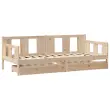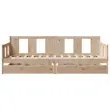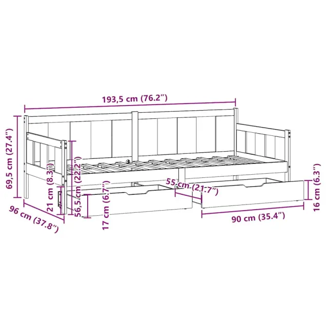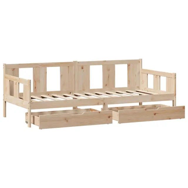 Ta dnevna postelja 2 v 1 s predali, ki služi kot kavč in postelja, je praktičen in privlačen dodatek za vašo dnevno sobo ali spalnico. Stabilen in dolgotrajen okvir: Trdna borovina je znana po svoji trdnosti in trajnosti. Ravni vzorci in značilni vozli prispevajo k njenemu rustikalnemu čaru.3-stranska posteljna ograja: Stranice te postelje se ponašajo z edinstvenim dizajnom, ki zagotavlja občutek varnosti in hkrati vašemu domu doda pridih prefinjenosti.Letvice za optimalno podporo: Postelja je opremljena z letvicami, ki zagotavljajo osnovno podporo in zračnost vašega ležišča.Rustikalni čar: Postelja daje vašemu prostoru rustikalne podtone, ki so lahko resnično sproščujoči. Pomirjujoč učinek te lesene dnevne postelje spremeni katero koli spalnico ali sobo za goste v pomirjujoč prostor, hkrati pa v prostor doda naravni element.Veliko prostora za shranjevanje: Ta postelja za goste ima dva predala, ki zagotavljata dovolj prostora za shranjevanje oblačil, nogavic, igrač, blazin itd. Dobro je vedeti:Vzmetnice niso priložene tej postelji. Ponujamo različno izbiro ležišč. V naši trgovini si lahko ogledate ustrezne vzmetnice.Material: Trdna borovina (neobdelana)Potrebno sestavljanje: DaPostelja:Celotne dimenzije: 193,5 x 96 x 69,5 cm (D x Š x V)Velikost primerne vzmetnice: 90 x 190 cm (Š x D) (vzmetnica ni priložena)Predal:Zunanje dimenzije: 90 x 55 x 17 cm (Š x G x V)Notranje dimenzije: 81,5 x 52,5 x 10 cm (Š x G x V)Maks. nosilnost (vsaka): 20 kgS štirimi kolesiPaket vsebuje:1 x Posteljni okvir2 x Predal 3302112