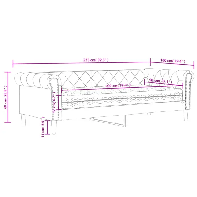 Ta 2 v 1 dnevna postelja z vzmetnico, ki služi kot kavč in postelja, je praktičen in privlačen dodatek za vašo dnevno sobo ali spalnico. Vsestranska dnevna postelja: Raztegljiv kavč se lahko čez dan uporablja kot kavč, ponoči pa kot postelja, kar je hitra rešitev za prenočevanje gostov.Udobna penasta vzmetnica: Ta postelja je opremljena z vzmetnico iz pene za največjo podporo in optimalno udobje.Trpežno umetno usnje in trdna konstrukcija:Ta dnevni kavč ima robusten okvir iz lesa in kovine ter je oblazinjen v trpežno umetno usnje, ki se enostavno čisti.Sodobno oblikovanje: Kavč postelja ima sodoben dizajn, ki ga odlikujejo čiste linije, minimalističen videz in naravna svetloba, vašim notranjim prostorom pa bo dodal sodoben stil!Barva: ČrnaMaterial: Umetno usnje (75 % polivinilklorid, 5 % bombaž, 20 % poliester), kovina, trden lesMaterial prevleke vzmetnice: PleteninaMaterial letvic: Vezan lesMaterial polnila: PenaDimenzije: 235 x 100 x 68 cm (D x Š x V)Dimenzije vzmetnice: 90 x 200 x 17 cm (Š x D x V)Višina naslonjal za roke, od tal: 68 cmVišina nog: 15 cmPotrebno sestavljanje: DaPaket vsebuje:1 x Dnevna postelja1 x Vzmetnica iz pene 3197719