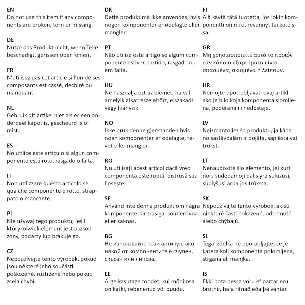 Tega izdelka ne uporabljajte, če je katera koli komponenta polomljena, strgana ali manjka.