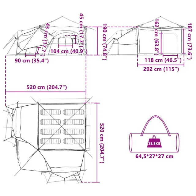 vidaXL Družinski notranji šotor Siva 520 x 520 x 190 cm
