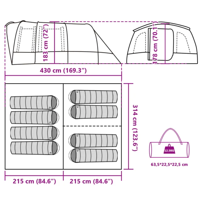 vidaXL Družinski šotor za 8 oseb siv vodoodporen