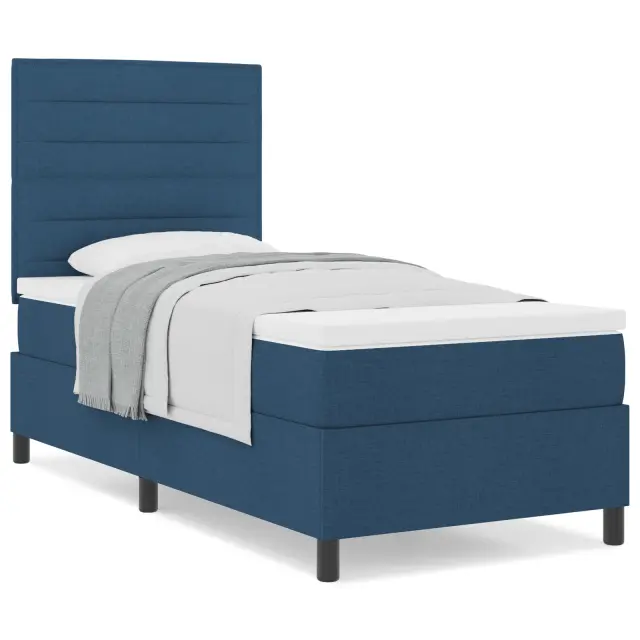Ta dvižna postelja združuje stil in funkcionalnost. Mornarsko modro blago in močne lesene noge popestrijo sobo, hkrati pa zagotavljajo udobje.
