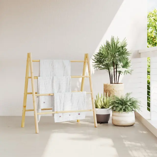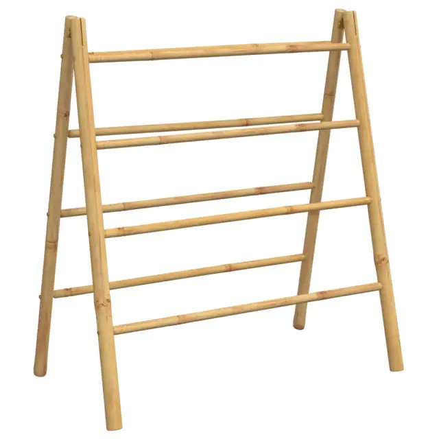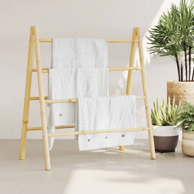 Ta dvojna bambusova lestev za brisače s 4 prečkami na obeh straneh je pametna in elegantna rešitev za shranjevanje v kopalnici, dnevni sobi, spalnici, hodniku itd.