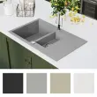 Visokokakovosten uporabljeni granit zagotavlja, da je pomivalno korito odporno na vročino, praske in udarce ter preprosto za čiščenje. Lahko se ga obrača, zato se ga lahko namesti na desno in levo stran. Zahvaljujoč delno pred-izvrtani odprtini, lahko s preprostim udarcem z majhnim kladivom ali okroglim orodjem namestite pipo. Priložen je tudi pokrov za odprtino iz nerjavečega jekla, ki bo pred-izvrtano odprtino zaščitil pred umazanijo ali prahom. Priloženo je tudi cedilo za enostavno odstranjevanje umazanije.