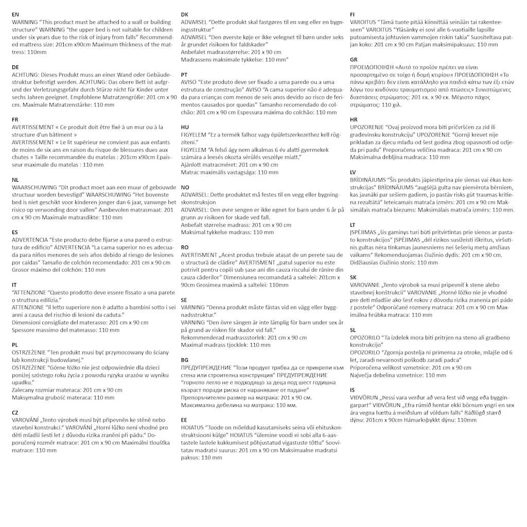 OPOZORILO "Ta izdelek mora biti pritrjen na steno ali gradbeno konstrukcijo" OPOZORILO "Zgornja postelja ni primerna za otroke, mlajše od 6 let, zaradi nevarnosti poškodb zaradi padca" Priporočena velikost vzmetnice: 201 cm x 90 cm Največja debelina vzmetnice: 110 mm