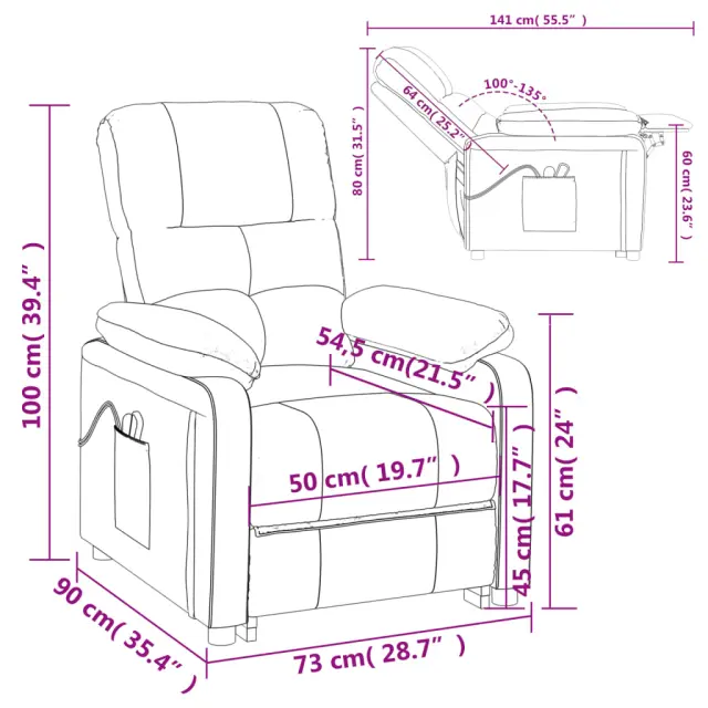 Namestite se in uživajte na tem izjemno udobnem električnem masažnem stolu! Električna funkcija nagibanja: Ta naslanjač je opremljen z električnim motorjem za lažje vstajanje. Ima 3 položaje za nagibanje, zato lahko naslonjalo za hrbet in naslonjalo za noge s priloženim ročnim upravljalnikom z dvema gumboma preprosto nastavite glede na svoje udobje.Funkcija vibriranja: 6 masažnih točk vam omogoča, da izkusite bolje usmerjeno masažo. Poleg tega vam priloženi ročni upravljalnik omogoča izbiro različnih programov masaže. Masažno funkcijo napaja USB priključek, vendar certificiran 5V vir napajanja USB ni priložen.Udobno sedenje: Sedež, naslonjalo za hrbet in široki nasloni za roke, prevlečeni s tkanino, zagotavljajo prijeten in topel občutek, zato se med sedenjem počutite prijetno. Preprosta in čista tkanina je tudi zračna in trpežna.Trden in stabilen okvir: Okvir iz lesa in kovine zagotavlja trdno strukturo in stabilnost. Ta naslanjač je udoben in trpežen.Barva: Svetlo sivaMaterial: TkaninaCelotne dimenzije: 73 x 90 x 100 cm (D x Š x V)Dimenzije sedeža: 50 x 54,5 x 45 cm (D x Š x V)Višina od naslonjala za roke do sedeža: 16 cmVišina naslonjala za roke, merjena od tal: 61 cmDolžina naslonjala: 64 cmMaksimalna nosilnost: 110 kgZ električnim motorjem za samodejno nastavitev naslonjala za hrbet in nogeVhodna moč: 100 - 240 V~, 50 - 60 HzIzhodna moč: DC 5 V, DC 28 VS 6 masažnimi programiPotrebno sestavljanje: Da 3073812