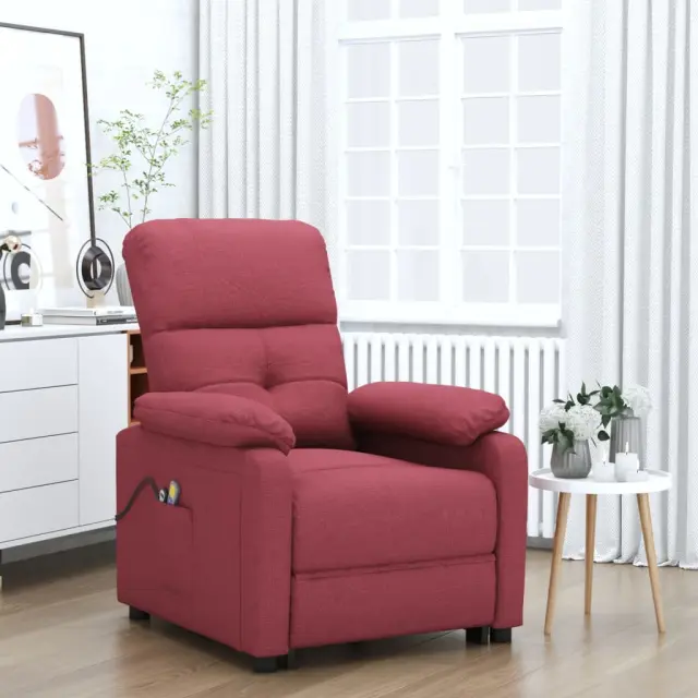 Namestite se in uživajte na tem izjemno udobnem električnem masažnem stolu! Električna funkcija nagibanja: Ta naslanjač je opremljen z električnim motorjem za lažje vstajanje. Ima 3 položaje za nagibanje, zato lahko naslonjalo za hrbet in naslonjalo za noge s priloženim ročnim upravljalnikom z dvema gumboma preprosto nastavite glede na svoje udobje.Funkcija vibriranja: 6 masažnih točk vam omogoča, da izkusite bolje usmerjeno masažo. Poleg tega vam priloženi ročni upravljalnik omogoča izbiro različnih programov masaže. Masažno funkcijo napaja USB priključek, vendar certificiran 5V vir napajanja USB ni priložen.Udobno sedenje: Sedež, naslonjalo za hrbet in široki nasloni za roke, prevlečeni s tkanino, zagotavljajo prijeten in topel občutek, zato se med sedenjem počutite prijetno. Preprosta in čista tkanina je tudi zračna in trpežna.Trden in stabilen okvir: Okvir iz lesa in kovine zagotavlja trdno strukturo in stabilnost. Ta naslanjač je udoben in trpežen.Barva: Vinsko rdečaMaterial: TkaninaCelotne dimenzije: 73 x 90 x 100 cm (D x Š x V)Dimenzije sedeža: 50 x 54,5 x 45 cm (D x Š x V)Višina od naslonjala za roke do sedeža: 16 cmVišina naslonjala za roke, merjena od tal: 61 cmDolžina naslonjala: 64 cmMaksimalna nosilnost: 110 kgZ električnim motorjem za samodejno nastavitev naslonjala za hrbet in nogeVhodna moč: 100 - 240 V~, 50 - 60 HzIzhodna moč: DC 5 V, DC 28 VS 6 masažnimi programiPotrebno sestavljanje: Da 3073815