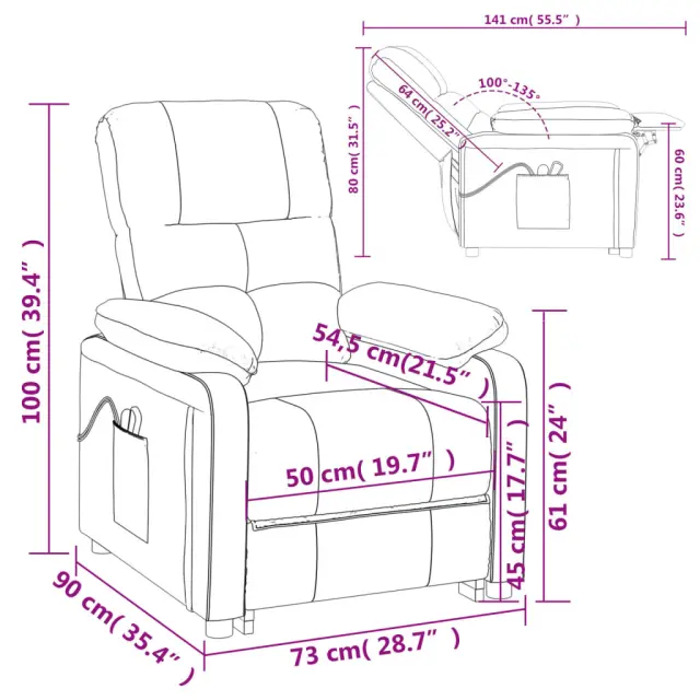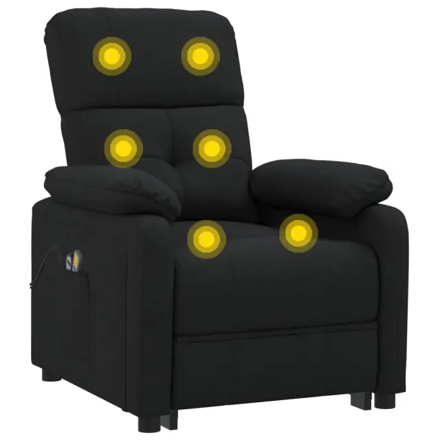 Namestite se in uživajte na tem izjemno udobnem električnem masažnem stolu! Električna funkcija nagibanja: Ta naslanjač je opremljen z električnim motorjem za lažje vstajanje. Ima 3 položaje za nagibanje, zato lahko naslonjalo za hrbet in naslonjalo za noge s priloženim ročnim upravljalnikom z dvema gumboma preprosto nastavite glede na svoje udobje.Funkcija vibriranja: 6 masažnih točk vam omogoča, da izkusite bolje usmerjeno masažo. Poleg tega vam priloženi ročni upravljalnik omogoča izbiro različnih programov masaže. Masažno funkcijo napaja USB priključek, vendar certificiran 5V vir napajanja USB ni priložen.Udobno sedenje: Sedež, naslonjalo za hrbet in široki nasloni za roke, prevlečeni s tkanino, zagotavljajo prijeten in topel občutek, zato se med sedenjem počutite prijetno. Preprosta in čista tkanina je tudi zračna in trpežna.Trden in stabilen okvir: Okvir iz lesa in kovine zagotavlja trdno strukturo in stabilnost. Ta naslanjač je udoben in trpežen.Barva: ČrnaMaterial: TkaninaCelotne dimenzije: 73 x 90 x 100 cm (D x Š x V)Dimenzije sedeža: 50 x 54,5 x 45 cm (D x Š x V)Višina od naslonjala za roke do sedeža: 16 cmVišina naslonjala za roke, merjena od tal: 61 cmDolžina naslonjala: 64 cmMaksimalna nosilnost: 110 kgZ električnim motorjem za samodejno nastavitev naslonjala za hrbet in nogeVhodna moč: 100 - 240 V~, 50 - 60 HzIzhodna moč: DC 5 V, DC 28 VS 6 masažnimi programiPotrebno sestavljanje: Da 3073814
