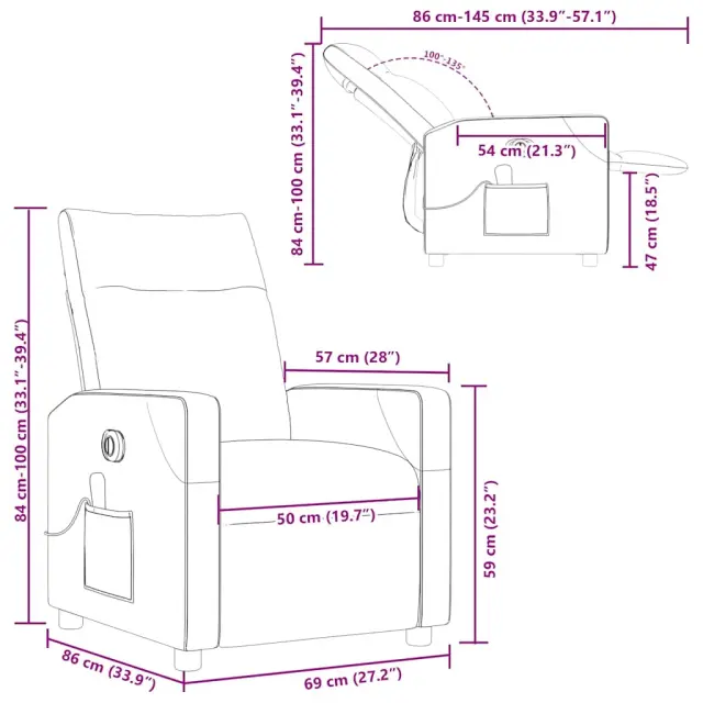 • Funkcija električnega nagiba: Ta naslanjač je opremljen z električnim motorjem, ki pomaga samodejno nastaviti naslon za noge in naslonjalo za hrbet v poljuben položaj glede na vaše udobje s preprostim pritiskom na gumb na strani stola. Ta funkcija omogoča največji nagib 135 stopinj. Poleg tega se lahko naslonjalo z enostavnim pritiskom na gumb samodejno vrne na prvotno mesto.