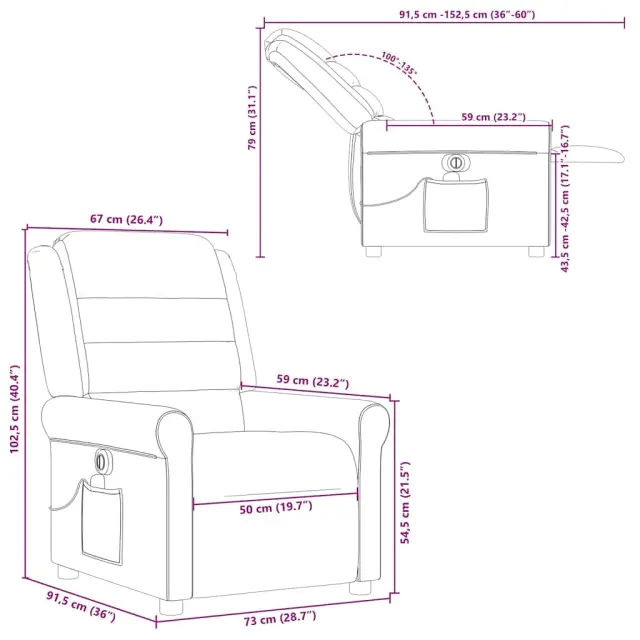 • Funkcija električnega nagiba: Ta naslanjač je opremljen z električnim motorjem, ki pomaga samodejno nastaviti naslon za noge in naslonjalo za hrbet v poljuben položaj glede na vaše udobje s preprostim pritiskom na gumb na strani stola. Ta funkcija omogoča največji nagib 135 stopinj. Poleg tega se lahko naslonjalo z enostavnim pritiskom na gumb samodejno vrne na prvotno mesto.