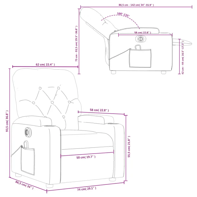 • Funkcija električnega nagiba: Ta naslanjač je opremljen z električnim motorjem, ki pomaga samodejno nastaviti naslon za noge in naslonjalo za hrbet v poljuben položaj glede na vaše udobje s preprostim pritiskom na gumb na strani stola. Ta funkcija omogoča največji nagib 135 stopinj. Poleg tega se lahko naslonjalo z enostavnim pritiskom na gumb samodejno vrne na prvotno mesto.