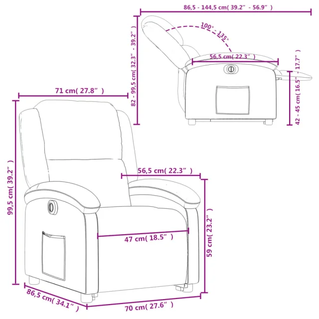 • Funkcija električnega nagiba: Ta naslanjač je opremljen tudi z električnim motorjem, ki pomaga samodejno nastaviti naslon za noge in naslonjalo za hrbet v poljuben položaj glede na vaše udobje s preprostim pritiskom na gumb na strani stola. Ta funkcija omogoča največji nagib 135 stopinj. Poleg tega se lahko naslonjalo z enostavnim pritiskom na gumb samodejno vrne na prvotno mesto.