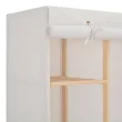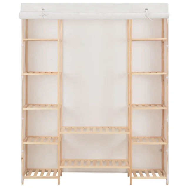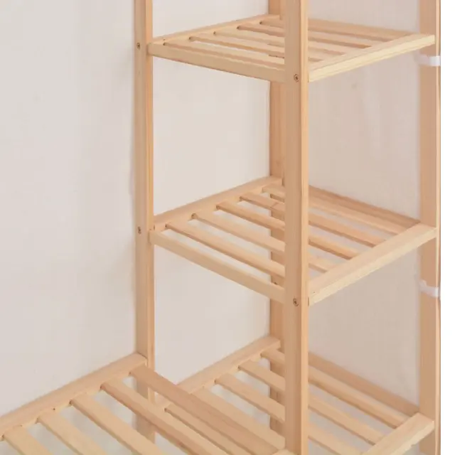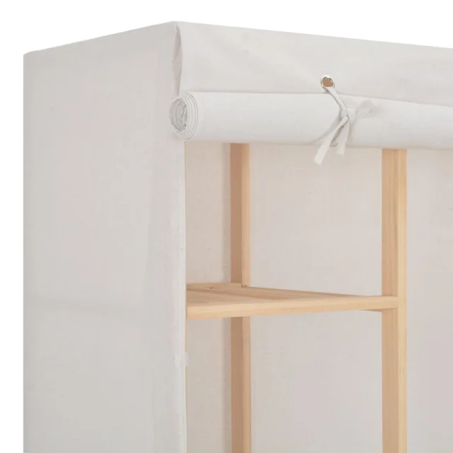 Ta organizator za oblačila ima trpežno leseno strukturo z več odprtimi predelki. Pokrivalo iz blaga bo skrilo vaša oblačila ter hkrati zagotovilo zaščito pred prahom. Naša garderobna omara iz blaga je preprosta za sestavo.