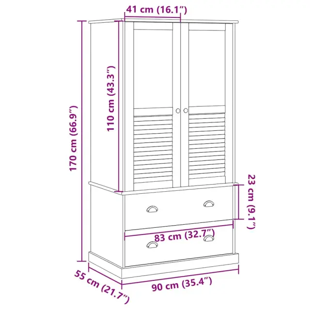 Ta klasična lesena garderobna omara ponuja veliko prostora za shranjevanje oblačil, čevljev in dodatkov. Trdna borovina: Trdna borovina je čudovit naravni material. Borovina ima ravne vzorce, grče pa dajejo materialu njegov značilen, rustikalen videz. Omara za shranjevanje je izdelana iz trdnega borovega lesa, zato je trpežna in stabilna.Veliko prostora za shranjevanje: Garderoba ima v notranjosti letev za obešanje oblačil in 2 predala za dodaten prostor za shranjevanje.Enostavno vzdrževanje: Organizator garderobe je enostavno očistiti z vlažno krpo in zahteva malo vzdrževanja.Kovinski ročaji in gumbi: Garderoba za spalnico je opremljena s kovinskimi ročaji in gumbi, ki olajšajo odpiranje in zapiranje omare, hkrati pa jo naredijo še lepšo. Opozorilo:Za preprečitev prevračanja je treba ta izdelek uporabiti s priloženo napravo za pritrditev na steno.Barva: BelaMaterial: Trdna borovina s prevleko iz voska, inženirski les, kovinaDimenzije: 90 x 55 x 170 cm (Š x G x V)Velikost vrat: 41 x 110 cm (Š x G)Zunanja velikost predala: 83 x 23 cm (D x Š)Notranje dimenzije predala: 77 x 35 x 16 cm (Š x G x V)Z zasnovo roletZbirka: VIGOPotrebno sestavljanje: DaLegal Documents:Več informacij o tem, kako preprečiti prevračanje pohištva, je na voljo tukaj 353164