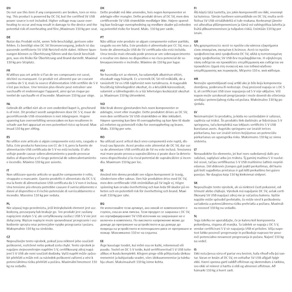 Tega izdelka ne uporabljajte, če je katera koli komponenta polomljena, strgana ali manjka. Ta izdelek se napaja z DC 5 V, vendar certificirani 5 V vir napajanja USB ni priložen. Višja napetost lahko povzroči pregrevanje in poškoduje napravo ter povzroči potencialno nevarnost pregrevanja in požara. Največ 110 kg na sedež.
