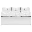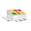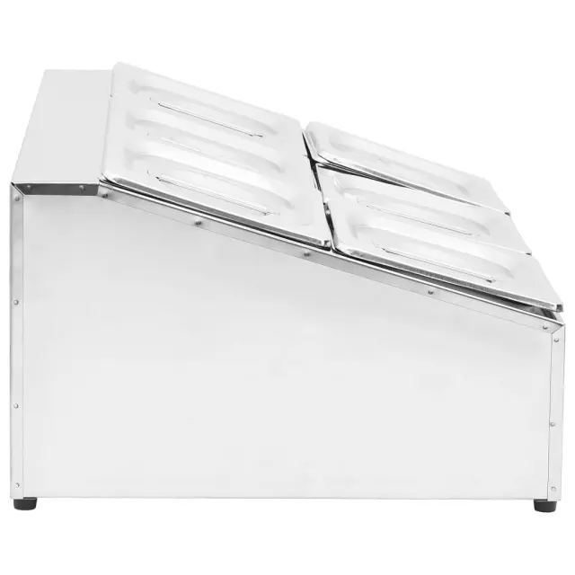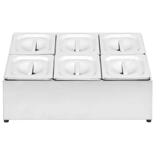 Ta posoda za solato iz nerjavečega jekla je preprosta za čiščenje in primerna za pomivalni stroj. Nedrseče gumijaste nogice zagotavljajo stabilnost ter delovno površino ščitijo pred praskami. Ta solatni bar ima priloženih 6 GN 1/6 posod, ki se jih lahko odstrani s stojala za enostavno polnjenje in praznjenje. Poleg tega so priloženi tudi ujemajoči se pokrovi, da bo vsebina ostala sveža in čista.