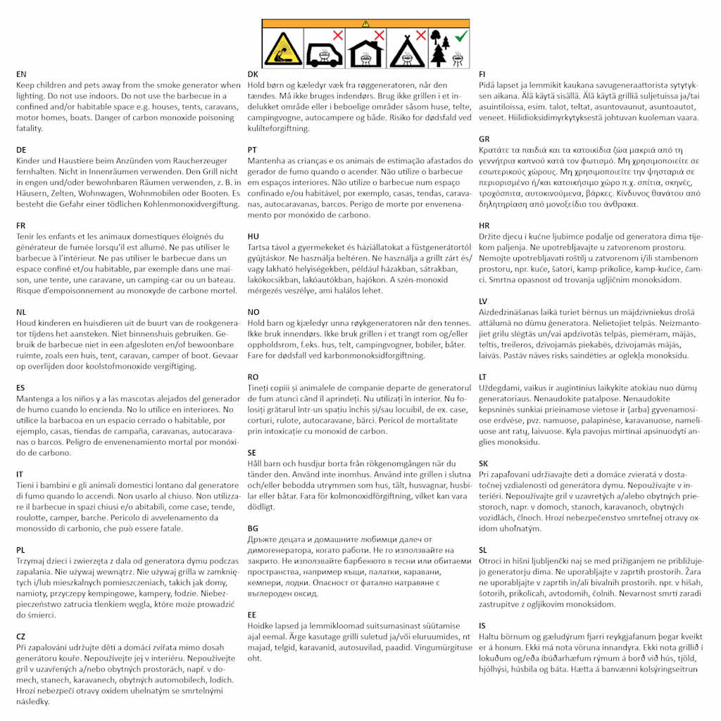 Otroci in hišni ljubljenčki naj se med prižiganjem ne približujejo generatorju dima. Ne uporabljajte v zaprtih prostorih. Žara ne uporabljajte v zaprtih in/ali bivalnih prostorih. npr. v hišah, šotorih, prikolicah, avtodomih, čolnih. Nevarnost smrti zaradi zastrupitve z ogljikovim monoksidom.