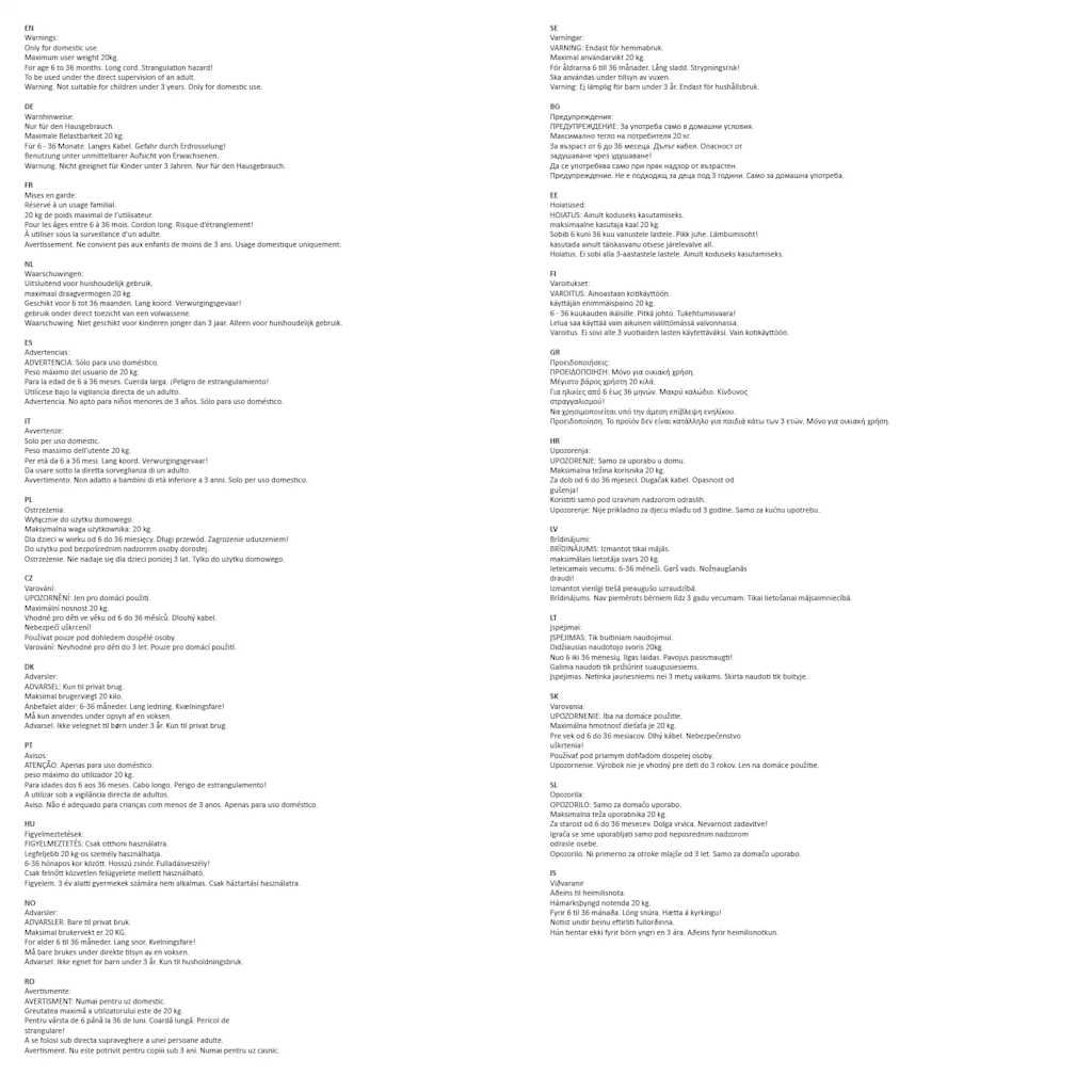 Opozorila: OPOZORILO: Samo za domačo uporabo. Maksimalna teža uporabnika 20 kg. Za starost od 6 do 36 mesecev. Dolga vrvica. Nevarnost zadavitve! Igrača se sme uporabljati samo pod neposrednim nadzorom odrasle osebe. Opozorilo. Ni primerno za otroke mlajše od 3 let. Samo za domačo uporabo.