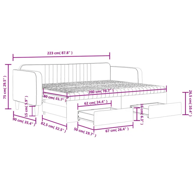 Ta 2 v 1 izvlečna dnevna postelja, ki služi kot kavč in postelja, je praktičen in privlačen dodatek za vašo dnevno sobo ali spalnico. Vsestranska dnevna postelja: Raztegljiva postelja čez dan deluje kot kavč, ponoči pa se z izvlečenim ležiščem zlahka spremeni v zakonsko posteljo, kar je priročna rešitev za sprejemanje gostov in maksimalno povečanje prostora.Veliko prostora za shranjevanje: Ta postelja za goste ima dva predala s kolesi, ki zagotavljata dovolj prostora za shranjevanje oblačil, nogavic, igrač, blazin itd.Udobna penasta vzmetnica: Ta postelja je opremljena z dvema vzmetnicama iz pene za največjo podporo in optimalno udobje.Mehak žamet in trdna konstrukcija: Ta dnevna postelja ima trpežen okvir iz lesa in kovine ter je oblazinjena z mehkim in udobnim žametom.Barva: ModraMaterial: Žamet (100 % poliester), kovina, trden les, inženirski lesMaterial letvic: Vezan lesMaterial prevleke vzmetnice: Kosmatena pleteninaMaterial polnila: PenaDimenzije (neraztegnjena): 223 x 90 x 75 cm (D x Š x V)Dimenzije (raztegnjena): 223 x 172,5 x 75 cm (D x Š x V)Dimenzije vzmetnice iz pene (vsaka): 80 x 200 x 10 cm (Š x D x V)Dimenzije posteljnega predala (vsak): 67 x 50 x 16 cm (D x Š x V)Višina naslonjal za roke, od tal: 68 cmVišina nog: 15 cmPotrebno sestavljanje: DaPaket vsebuje:1 x Izvlečna dnevna postelja2 x Posteljni predal2 x Vzmetnica iz pene 3197127