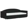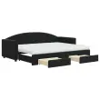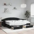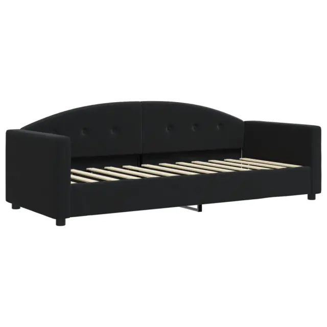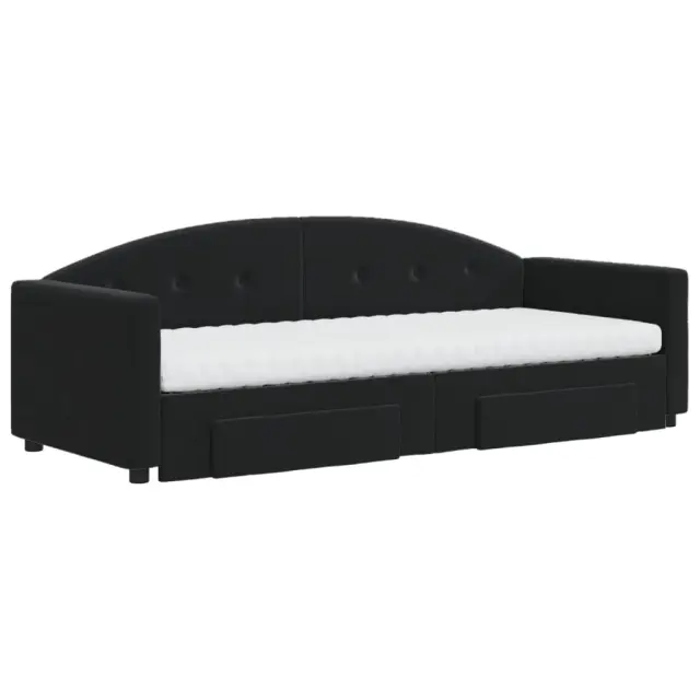 Ta 2 v 1 izvlečna dnevna postelja s predali, ki služi kot kavč in postelja, je praktičen in privlačen dodatek za vašo dnevno sobo ali spalnico. Vsestranska dnevna postelja: Raztegljiva postelja čez dan deluje kot kavč, ponoči pa se z izvlečenim ležiščem zlahka spremeni v zakonsko posteljo, kar je priročna rešitev za sprejemanje gostov in maksimalno povečanje prostora. Veliko prostora za shranjevanje: Ta postelja za goste ima dva predala s kolesi, ki zagotavljata dovolj prostora za shranjevanje oblačil, nogavic, igrač, blazin itd. Udobna penasta vzmetnica: Ta postelja je opremljena z dvema vzmetnicama iz pene za največjo podporo in optimalno udobje. Mehak žamet in trdna konstrukcija: Ta dnevna postelja ima trpežen okvir iz lesa in kovine ter je oblazinjena z mehkim in udobnim žametom.Barva: ČrnaMaterial: Žamet (100 % poliester), kovina, trden les, inženirski lesMaterial letvic: Vezan lesMaterial polnila: Pena Material prevleke vzmetnice: Kosmatena pleteninaDimenzije (neraztegnjena): 222 x 90 x 75 cm (D x Š x V)Dimenzije (raztegnjena): 222 x 172,5 x 75 cm (D x Š x V)Dimenzije vzmetnice iz pene (vsaka): 80 x 200 x 10 cm (Š x D x D)Dimenzije posteljnega predala (vsak): 67 x 50 x 16 cm (D x Š x V)Višina naslonjala za roke, merjena od tal: 58 cmVišina nog: 5 cmPotrebno sestavljanje: DaPaket vsebuje:1 x Izvlečna dnevna postelja 2 x Vzmetnica iz pene2 x Posteljni predal 3197370