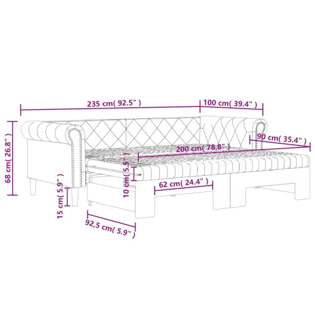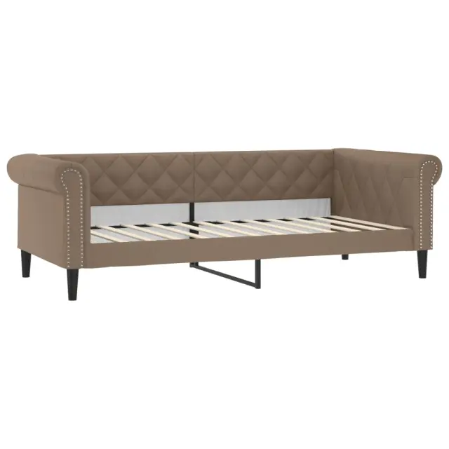 Ta 2 v 1 izvlečna dnevna postelja, ki služi kot kavč in postelja, je praktičen in privlačen dodatek za vašo dnevno sobo ali spalnico. Vsestranska dnevna postelja: Raztegljiva postelja čez dan deluje kot kavč, ponoči pa se z izvlečenim ležiščem zlahka spremeni v zakonsko posteljo, kar je priročna rešitev za sprejemanje gostov in maksimalno povečanje prostora.Udobna penasta vzmetnica: Ta postelja je opremljena z dvema vzmetnicama iz pene za največjo podporo in optimalno udobje.Trpežno umetno usnje in trdna konstrukcija:Ta dnevni kavč ima robusten okvir iz lesa in kovine ter je oblazinjen v trpežno umetno usnje, ki se enostavno čisti.Sodobno oblikovanje: Kavč postelja ima sodoben dizajn, ki ga odlikujejo čiste linije, minimalističen videz in naravna svetloba, vašim notranjim prostorom pa bo dodal sodoben stil!Barva: KapučinoMaterial: Umetno usnje (75 % polivinilklorid, 5 % bombaž, 20 % poliester), kovina, trden lesMaterial prevleke vzmetnice: Kosmatena pleteninaMaterial letvic: Vezan lesMaterial polnila: PenaDimenzije (neraztegnjena): 235 x 100 x 68 cm (D x Š x V)Dimenzije (raztegnjena): 235 x 192,5 x 68 cm (D x Š x V)Dimenzije vzmetnice iz pene (vsaka): 90 x 200 x 10 cm (Š x D x V)Višina naslonjal za roke, od tal: 68 cmVišina nog: 15 cmPotrebno sestavljanje: DaPaket vsebuje:1 x Izvlečna dnevna postelja2 x Vzmetnica iz pene 3197730