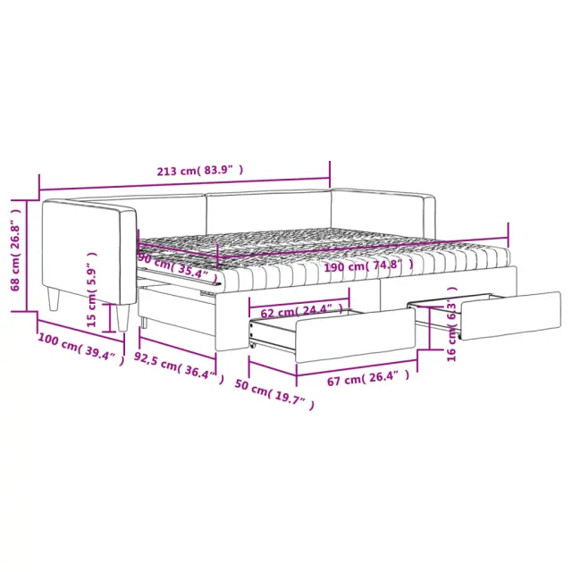 Ta 2 v 1 izvlečna dnevna postelja, ki služi kot kavč in postelja, je praktičen in privlačen dodatek za vašo dnevno sobo ali spalnico. Vsestranska dnevna postelja: Raztegljiva postelja čez dan deluje kot kavč, ponoči pa se z izvlečenim ležiščem zlahka spremeni v zakonsko posteljo, kar je priročna rešitev za sprejemanje gostov in maksimalno povečanje prostora. Veliko prostora za shranjevanje: Ta postelja za goste ima dva predala s kolesi, ki zagotavljata dovolj prostora za shranjevanje oblačil, nogavic, igrač, blazin itd. Udobna penasta vzmetnica: Ta postelja je opremljena z dvema vzmetnicama iz pene za največjo podporo in optimalno udobje. Vzdržljiva tkanina in trdna konstrukcija: Ta dnevni kavč ima trpežen okvir iz lesa in kovine ter je oblazinjen s trpežno in udobno tkanino.Barva: Črna Material: Tkanina (100 % poliester), kovina, trden les, inženirski lesMaterial letvic: Vezan les Material polnila: Pena Dimenzije (neraztegnjena): 213 x 100 x 68 cm (D x Š x V) Dimenzije (raztegnjena): 213 x 192,5 x 68 cm (D x Š x V) Dimenzije vzmetnice iz pene (vsaka): 90 x 190 x 10 cm (Š x D x V)Dimenzije posteljnega predala (vsak): 67 x 50 x 16 cm (D x Š x V)Višina naslonjal za roke, od tal: 68 cmVišina nog: 15 cm Potrebno sestavljanje: DaPaket vsebuje:1 x Izvlečna dnevna postelja 2 x Vzmetnica iz pene2 x Posteljni predal 3196644