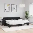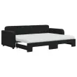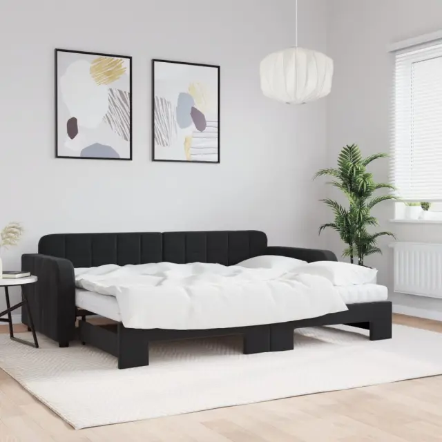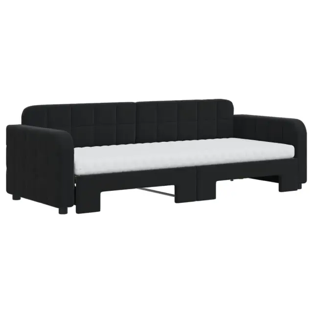 Ta 2 v 1 izvlečna dnevna postelja, ki služi kot kavč in postelja, je praktičen in privlačen dodatek za vašo dnevno sobo ali spalnico. Vsestranska dnevna postelja: Raztegljiva postelja čez dan deluje kot kavč, ponoči pa se z izvlečenim ležiščem zlahka spremeni v zakonsko posteljo, kar je priročna rešitev za sprejemanje gostov in maksimalno povečanje prostora.Udobna penasta vzmetnica: Ta postelja je opremljena z dvema vzmetnicama iz pene za največjo podporo in optimalno udobje.Mehak žamet in trdna konstrukcija: Ta dnevna postelja ima trpežen okvir iz lesa in kovine ter je oblazinjena z mehkim in udobnim žametom.Barva: ČrnaMaterial: Žamet (100% poliester), kovina, trden lesMaterial letvic: Vezan lesMaterial prevleke vzmetnice: Kosmatena pleteninaMaterial polnila: PenaDimenzije (neraztegnjena): 223 x 91 x 71 cm (D x Š x V)Dimenzije (raztegnjena): 223 x 173,5 x 71 cm (D x Š x V)Dimenzije vzmetnice iz pene (vsaka): 80 x 200 x 10 cm (Š x D x V)Višina naslonjala za roke, merjena od tal: 58 cmVišina nog: 5 cmPotrebno sestavljanje: DaPaket vsebuje:1 x Izvlečna dnevna postelja2 x Vzmetnica iz pene 3196950