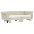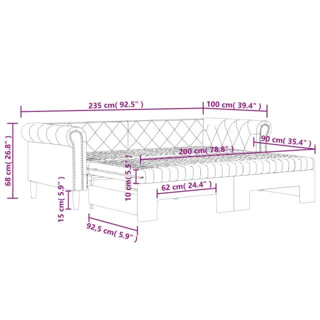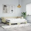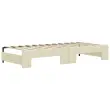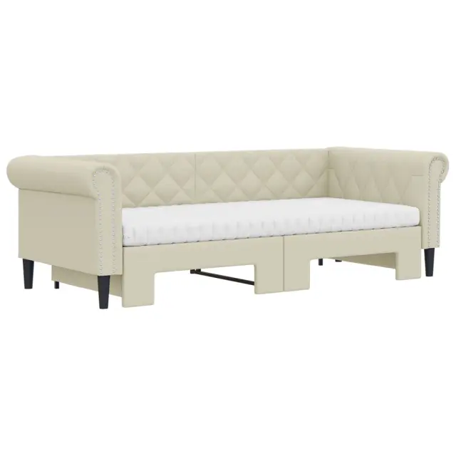 Ta 2 v 1 izvlečna dnevna postelja, ki služi kot kavč in postelja, je praktičen in privlačen dodatek za vašo dnevno sobo ali spalnico. Vsestranska dnevna postelja: Raztegljiva postelja čez dan deluje kot kavč, ponoči pa se z izvlečenim ležiščem zlahka spremeni v zakonsko posteljo, kar je priročna rešitev za sprejemanje gostov in maksimalno povečanje prostora.Udobna penasta vzmetnica: Ta postelja je opremljena z dvema vzmetnicama iz pene za največjo podporo in optimalno udobje.Trpežno umetno usnje in trdna konstrukcija:Ta dnevni kavč ima robusten okvir iz lesa in kovine ter je oblazinjen v trpežno umetno usnje, ki se enostavno čisti.Sodobno oblikovanje: Kavč postelja ima sodoben dizajn, ki ga odlikujejo čiste linije, minimalističen videz in naravna svetloba, vašim notranjim prostorom pa bo dodal sodoben stil!Barva: KremMaterial: Umetno usnje (75 % polivinilklorid, 5 % bombaž, 20 % poliester), kovina, trden lesMaterial prevleke vzmetnice: Kosmatena pleteninaMaterial letvic: Vezan lesMaterial polnila: PenaDimenzije (neraztegnjena): 235 x 100 x 68 cm (D x Š x V)Dimenzije (raztegnjena): 235 x 192,5 x 68 cm (D x Š x V)Dimenzije vzmetnice iz pene (vsaka): 90 x 200 x 10 cm (Š x D x V)Višina naslonjal za roke, od tal: 68 cmVišina nog: 15 cmPotrebno sestavljanje: DaPaket vsebuje:1 x Izvlečna dnevna postelja2 x Vzmetnica iz pene 3197729