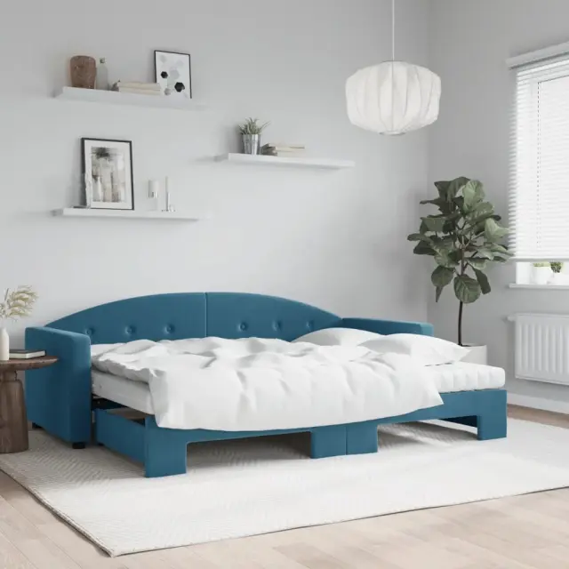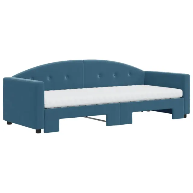 Ta 2 v 1 izvlečna dnevna postelja z vzmetnico, ki služi kot kavč in postelja, je praktičen in privlačen dodatek za vašo dnevno sobo ali spalnico. Vsestranska dnevna postelja: Raztegljiva postelja čez dan deluje kot kavč, ponoči pa se z izvlečenim ležiščem zlahka spremeni v zakonsko posteljo, kar je priročna rešitev za sprejemanje gostov in maksimalno povečanje prostora.Udobna penasta vzmetnica: Ta postelja je opremljena z dvema vzmetnicama iz pene za največjo podporo in optimalno udobje. Mehak žamet in trdna konstrukcija: Ta dnevna postelja ima trpežen okvir iz lesa in kovine ter je oblazinjena z mehkim in udobnim žametom.Barva: ModraMaterial: Žamet (100% poliester), kovina, trden lesMaterial letvic: Vezan lesMaterial polnila: Pena Material prevleke vzmetnice: Kosmatena pleteninaDimenzije (neraztegnjena): 222 x 90 x 75 cm (D x Š x V)Dimenzije (raztegnjena): 222 x 172,5 x 75 cm (D x Š x V)Dimenzije vzmetnice iz pene (vsaka): 80 x 200 x 10 cm (Š x D x D)Višina naslonjala za roke, merjena od tal: 58 cmVišina nog: 5 cmPotrebno sestavljanje: DaPaket vsebuje:1 x Izvlečna dnevna postelja 2 x Vzmetnica iz pene 3197317