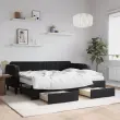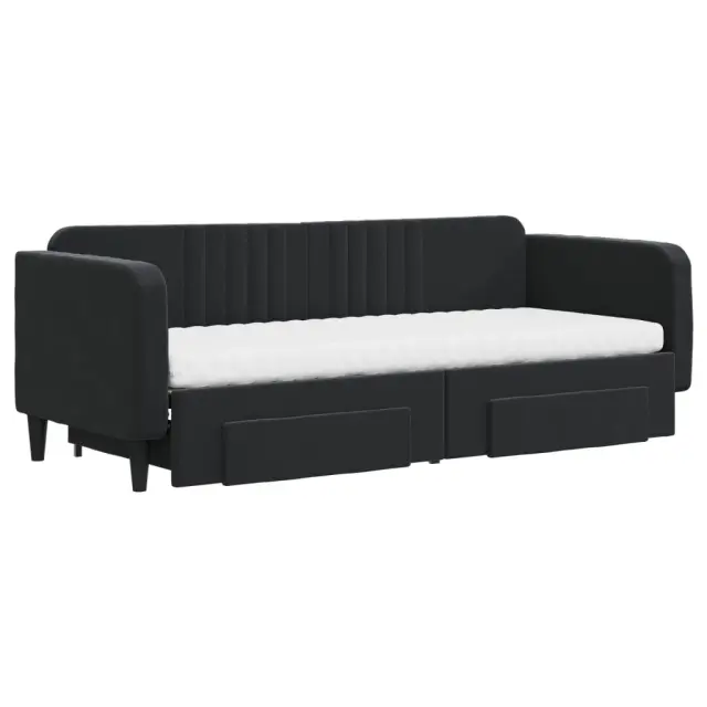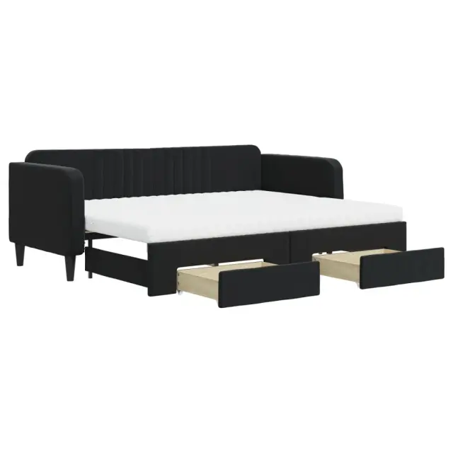 Ta 2 v 1 izvlečna dnevna postelja, ki služi kot kavč in postelja, je praktičen in privlačen dodatek za vašo dnevno sobo ali spalnico. Vsestranska dnevna postelja: Raztegljiva postelja čez dan deluje kot kavč, ponoči pa se z izvlečenim ležiščem zlahka spremeni v zakonsko posteljo, kar je priročna rešitev za sprejemanje gostov in maksimalno povečanje prostora.Veliko prostora za shranjevanje: Ta postelja za goste ima dva predala s kolesi, ki zagotavljata dovolj prostora za shranjevanje oblačil, nogavic, igrač, blazin itd.Udobna penasta vzmetnica: Ta postelja je opremljena z dvema vzmetnicama iz pene za največjo podporo in optimalno udobje.Mehak žamet in trdna konstrukcija: Ta dnevna postelja ima trpežen okvir iz lesa in kovine ter je oblazinjena z mehkim in udobnim žametom.Barva: ČrnaMaterial: Žamet (100 % poliester), kovina, trden les, inženirski lesMaterial letvic: Vezan lesMaterial prevleke vzmetnice: Kosmatena pleteninaMaterial polnila: PenaDimenzije (neraztegnjena): 223 x 90 x 75 cm (D x Š x V)Dimenzije (raztegnjena): 223 x 172,5 x 75 cm (D x Š x V)Dimenzije vzmetnice iz pene (vsaka): 80 x 200 x 10 cm (Š x D x V)Dimenzije posteljnega predala (vsak): 67 x 50 x 16 cm (D x Š x V)Višina naslonjal za roke, od tal: 68 cmVišina nog: 15 cmPotrebno sestavljanje: DaPaket vsebuje:1 x Izvlečna dnevna postelja2 x Posteljni predal2 x Vzmetnica iz pene 3197132
