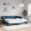 Ta 2 v 1 izvlečna dnevna postelja, ki služi kot kavč in postelja, je praktičen in privlačen dodatek za vašo dnevno sobo ali spalnico. Vsestranska dnevna postelja: Raztegljiva postelja čez dan deluje kot kavč, ponoči pa se z izvlečenim ležiščem zlahka spremeni v zakonsko posteljo, kar je priročna rešitev za sprejemanje gostov in maksimalno povečanje prostora.Udobna penasta vzmetnica: Ta postelja je opremljena z dvema vzmetnicama iz pene za največjo podporo in optimalno udobje.Mehak žamet in trdna konstrukcija: Ta dnevna postelja ima trpežen okvir iz lesa in kovine ter je oblazinjena z mehkim in udobnim žametom.Sodobno oblikovanje: Kavč postelja ima sodoben dizajn, ki ga odlikujejo čiste linije, minimalističen videz in naravna svetloba, vašim notranjim prostorom pa bo dodal sodoben stil!Barva: ModraMaterial: Žamet (100% poliester), kovina, trden lesMaterial letvic: Vezan lesMaterial prevleke vzmetnice: Kosmatena pleteninaMaterial polnila: PenaDimenzije (neraztegnjena): 223 x 110 x 75 cm (D x Š x V)Dimenzije (raztegnjena): 223 x 212,5 x 75 cm (D x Š x V)Dimenzije vzmetnice iz pene (vsaka): 100 x 200 x 10 cm (Š x D x V)Višina naslonjal za roke, od tal: 68 cmVišina nog: 15 cmPotrebno sestavljanje: DaPaket vsebuje:1 x Izvlečna dnevna postelja2 x Vzmetnica iz pene 3197093