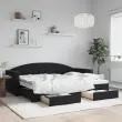 Ta 2 v 1 izvlečna dnevna postelja s predali, ki služi kot kavč in postelja, je praktičen in privlačen dodatek za vašo dnevno sobo ali spalnico. Vsestranska dnevna postelja: Raztegljiva postelja čez dan deluje kot kavč, ponoči pa se z izvlečenim ležiščem zlahka spremeni v zakonsko posteljo, kar je priročna rešitev za sprejemanje gostov in maksimalno povečanje prostora.Veliko prostora za shranjevanje: Ta postelja za goste ima dva predala s kolesi, ki zagotavljata dovolj prostora za shranjevanje oblačil, nogavic, igrač, blazin itd.Mehak žamet in trdna konstrukcija: Ta dnevna postelja ima trpežen okvir iz lesa in kovine ter je oblazinjena z mehkim in udobnim žametom. Dobro je vedeti:Vzmetnice niso priložene tej postelji. Ponujamo različno izbiro ležišč. V naši trgovini si lahko ogledate ustrezne vzmetnice.Barva: ČrnaMaterial: Žamet (100 % poliester), kovina, trden les, inženirski lesMaterial letvic: Vezan lesMaterial polnila: Pena Dimenzije (neraztegnjena): 222 x 90 x 75 cm (D x Š x V)Dimenzije (raztegnjena): 222 x 172,5 x 75 cm (D x Š x V)Dimenzije posteljnega predala (vsak): 67 x 50 x 16 cm (D x Š x V)Višina naslonjala za roke, merjena od tal: 58 cmVišina nog: 5 cmPrimerna velikost vzmetnice: 80 x 200 cm (Š x D)Potrebno: 2 x vzmetnica (ni vključena)Potrebno sestavljanje: DaPaket vsebuje:1 x Izvlečna dnevna postelja2 x Posteljni predal 3197346