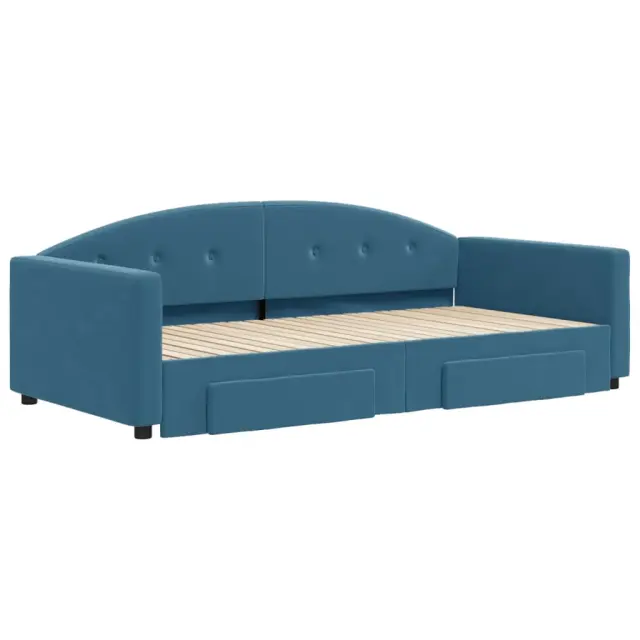 Ta 2 v 1 izvlečna dnevna postelja s predali, ki služi kot kavč in postelja, je praktičen in privlačen dodatek za vašo dnevno sobo ali spalnico. Vsestranska dnevna postelja: Raztegljiva postelja čez dan deluje kot kavč, ponoči pa se z izvlečenim ležiščem zlahka spremeni v zakonsko posteljo, kar je priročna rešitev za sprejemanje gostov in maksimalno povečanje prostora.Veliko prostora za shranjevanje: Ta postelja za goste ima dva predala s kolesi, ki zagotavljata dovolj prostora za shranjevanje oblačil, nogavic, igrač, blazin itd.Mehak žamet in trdna konstrukcija: Ta dnevna postelja ima trpežen okvir iz lesa in kovine ter je oblazinjena z mehkim in udobnim žametom. Dobro je vedeti:Vzmetnice niso priložene tej postelji. Ponujamo različno izbiro ležišč. V naši trgovini si lahko ogledate ustrezne vzmetnice.Barva: ModraMaterial: Žamet (100 % poliester), kovina, trden les, inženirski lesMaterial letvic: Vezan lesMaterial polnila: Pena Dimenzije (raztegnjena): 222 x 110 x 75 cm (D x Š x V)Dimenzije (raztegnjena): 222 x 212,5 x 75 cm (D x Š x V)Dimenzije posteljnega predala (vsak): 67 x 50 x 16 cm (D x Š x V)Višina naslonjala za roke, merjena od tal: 58 cmVišina nog: 5 cmVelikost primerne vzmetnice: 100 x 200 cm (Š x D)Potrebno: 2 x vzmetnica (ni vključena)Potrebno sestavljanje: DaPaket vsebuje:1 x Izvlečna dnevna postelja2 x Posteljni predal 3197355