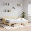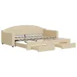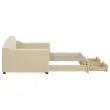 Ta 2 v 1 izvlečna dnevna postelja, ki služi kot kavč in postelja, je praktičen in privlačen dodatek za vašo dnevno sobo ali spalnico. Vsestranska dnevna postelja: Raztegljiva postelja čez dan deluje kot kavč, ponoči pa se z izvlečenim ležiščem zlahka spremeni v zakonsko posteljo, kar je priročna rešitev za sprejemanje gostov in maksimalno povečanje prostora. Veliko prostora za shranjevanje: Ta postelja za goste ima dva predala s kolesi, ki zagotavljata dovolj prostora za shranjevanje oblačil, nogavic, igrač, blazin itd. Vzdržljiva tkanina in trdna konstrukcija: Ta dnevni kavč ima trpežen okvir iz lesa in kovine ter je oblazinjen s trpežno in udobno tkanino. Dobro je vedeti:Vzmetnice niso priložene tej dnevni postelji. Ponujamo različno izbiro ležišč. V naši trgovini si lahko ogledate ustrezne vzmetnice.Barva: Krem Material: Tkanina (100 % poliester), kovina, trden les, inženirski lesMaterial letvic: Vezan les Material polnila: Pena Dimenzije (neraztegnjena): 223 x 100 x 75 cm (D x Š x V) Dimenzije (raztegnjena): 223 x 192,5 x 75 cm (D x Š x V) Dimenzije posteljnega predala (vsak): 67 x 50 x 16 cm (D x Š x V)Višina naslonjala za roke, merjena od tal: 58 cmVišina nog: 5 cm Velikost primerne vzmetnice: 90 x 200 cm (Š x D) Potrebno: 2 x vzmetnica (ni vključena) Potrebno sestavljanje: DaPaket vsebuje:1 x Izvlečna dnevna postelja 2 x Posteljni predal 3197570