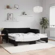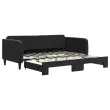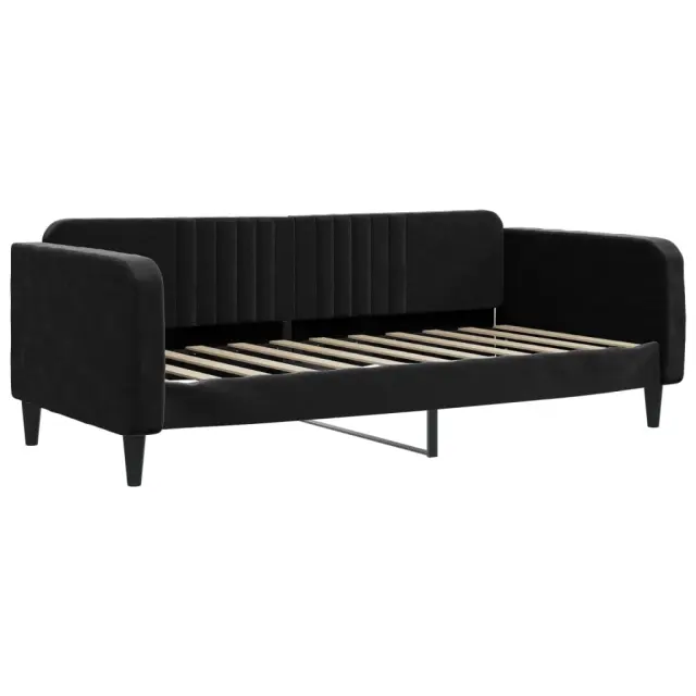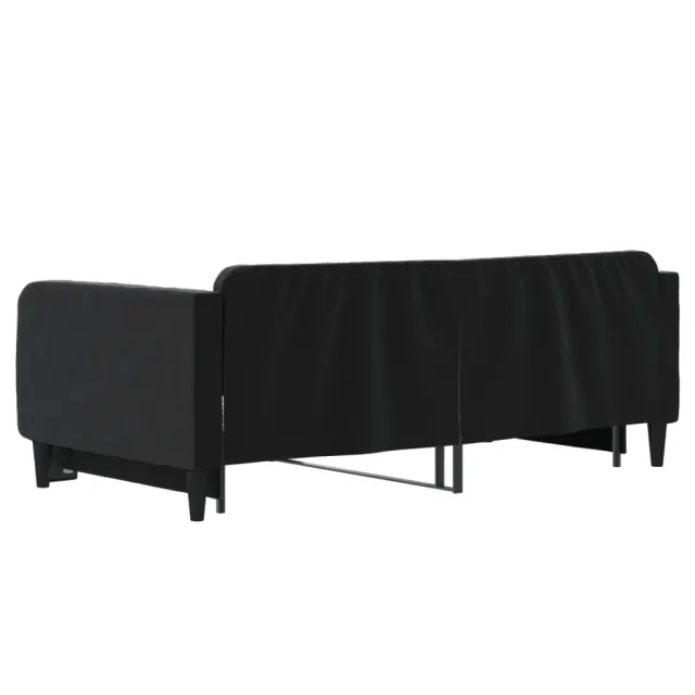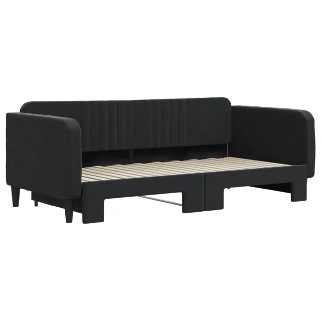 Ta 2 v 1 izvlečna dnevna postelja, ki služi kot kavč in postelja, je praktičen in privlačen dodatek za vašo dnevno sobo ali spalnico. Vsestranska dnevna postelja: Raztegljiva postelja čez dan deluje kot kavč, ponoči pa se z izvlečenim ležiščem zlahka spremeni v zakonsko posteljo, kar je priročna rešitev za sprejemanje gostov in maksimalno povečanje prostora.Mehak žamet in trdna konstrukcija: Ta dnevna postelja ima trpežen okvir iz lesa in kovine ter je oblazinjena z mehkim in udobnim žametom.Sodobno oblikovanje: Kavč postelja ima sodoben dizajn, ki ga odlikujejo čiste linije, minimalističen videz in naravna svetloba, vašim notranjim prostorom pa bo dodal sodoben stil! Dobro je vedeti:Vzmetnice niso priložene tej postelji. Ponujamo različno izbiro ležišč. V naši trgovini si lahko ogledate ustrezne vzmetnice.Barva: ČrnaMaterial: Žamet (100% poliester), kovina, trden lesMaterial letvic: Vezan lesMaterial polnila: PenaDimenzije (neraztegnjena): 213 x 100 x 75 cm (D x Š x V)Dimenzije (raztegnjena): 213 x 192,5 x 75 cm (D x Š x V)Višina naslonjal za roke, od tal: 68 cmVišina nog: 15 cmVelikost primerne vzmetnice: 90 x 190 cm (Š x D)Potrebno: 2 x vzmetnica (ni vključena)Potrebno sestavljanje: Da 3197078