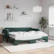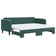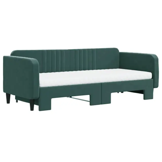Ta 2 v 1 izvlečna dnevna postelja, ki služi kot kavč in postelja, je praktičen in privlačen dodatek za vašo dnevno sobo ali spalnico. Vsestranska dnevna postelja: Raztegljiva postelja čez dan deluje kot kavč, ponoči pa se z izvlečenim ležiščem zlahka spremeni v zakonsko posteljo, kar je priročna rešitev za sprejemanje gostov in maksimalno povečanje prostora.Udobna penasta vzmetnica: Ta postelja je opremljena z dvema vzmetnicama iz pene za največjo podporo in optimalno udobje.Mehak žamet in trdna konstrukcija: Ta dnevna postelja ima trpežen okvir iz lesa in kovine ter je oblazinjena z mehkim in udobnim žametom.Sodobno oblikovanje: Kavč postelja ima sodoben dizajn, ki ga odlikujejo čiste linije, minimalističen videz in naravna svetloba, vašim notranjim prostorom pa bo dodal sodoben stil!Barva: Temno zelenaMaterial: Žamet (100% poliester), kovina, trden lesMaterial letvic: Vezan lesMaterial prevleke vzmetnice: Kosmatena pleteninaMaterial polnila: PenaDimenzije (neraztegnjena): 223 x 100 x 75 cm (D x Š x V)Dimenzije (raztegnjena): 223 x 192,5 x 75 cm (D x Š x V)Dimenzije vzmetnice iz pene (vsaka): 90 x 200 x 10 cm (Š x D x V)Višina naslonjal za roke, od tal: 68 cmVišina nog: 15 cmPotrebno sestavljanje: DaPaket vsebuje:1 x Izvlečna dnevna postelja2 x Vzmetnica iz pene 3197089