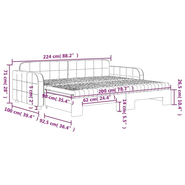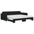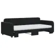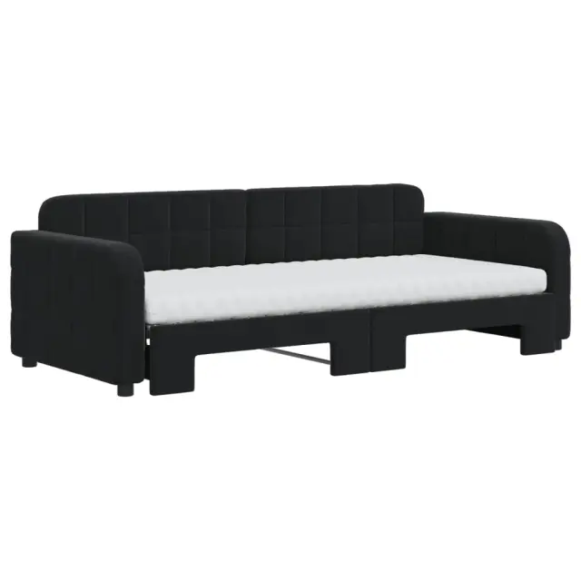 Ta 2 v 1 izvlečna dnevna postelja, ki služi kot kavč in postelja, je praktičen in privlačen dodatek za vašo dnevno sobo ali spalnico. Vsestranska dnevna postelja: Raztegljiva postelja čez dan deluje kot kavč, ponoči pa se z izvlečenim ležiščem zlahka spremeni v zakonsko posteljo, kar je priročna rešitev za sprejemanje gostov in maksimalno povečanje prostora.Udobna penasta vzmetnica: Ta postelja je opremljena z dvema vzmetnicama iz pene za največjo podporo in optimalno udobje.Mehak žamet in trdna konstrukcija: Ta dnevna postelja ima trpežen okvir iz lesa in kovine ter je oblazinjena z mehkim in udobnim žametom.Barva: ČrnaMaterial: Žamet (100% poliester), kovina, trden lesMaterial letvic: Vezan lesMaterial prevleke vzmetnice: Kosmatena pleteninaMaterial polnila: PenaDimenzije (neraztegnjena): 224 x 100 x 71 cm (D x Š x V)Dimenzije (raztegnjena): 224 x 192,5 x 71 cm (D x Š x V)Dimenzije vzmetnice iz pene (vsaka): 90 x 200 x 10 cm (Š x D x V)Višina naslonjala za roke, merjena od tal: 58 cmVišina nog: 5 cmPotrebno sestavljanje: DaPaket vsebuje:1 x Izvlečna dnevna postelja2 x Vzmetnica iz pene 3196957