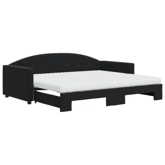 Ta 2 v 1 izvlečna dnevna postelja z vzmetnicami, ki služi kot kavč in postelja, je praktičen in privlačen dodatek za vašo dnevno sobo ali spalnico. Vsestranska dnevna postelja: Raztegljiva postelja čez dan deluje kot kavč, ponoči pa se z izvlečenim ležiščem zlahka spremeni v zakonsko posteljo, kar je priročna rešitev za sprejemanje gostov in maksimalno povečanje prostora.Udobna penasta vzmetnica: Ta postelja je opremljena z dvema vzmetnicama iz pene za največjo podporo in optimalno udobje. Mehak žamet in trdna konstrukcija: Ta dnevna postelja ima trpežen okvir iz lesa in kovine ter je oblazinjena z mehkim in udobnim žametom.Barva: ČrnaMaterial: Žamet (100% poliester), kovina, trden lesMaterial letvic: Vezan lesMaterial polnila: Pena Material prevleke vzmetnice: Kosmatena pleteninaDimenzije (neraztegnjena): 212 x 100 x 75 cm (D x Š x V)Dimenzije (raztegnjena): 212 x 192,5 x 75 cm (D x Š x V)Dimenzije vzmetnice iz pene (vsaka): 90 x 190 x 10 cm (Š x D x D)Višina naslonjala za roke, merjena od tal: 58 cmVišina nog: 5 cmPotrebno sestavljanje: DaPaket vsebuje:1 x Izvlečna dnevna postelja 2 x Vzmetnica iz pene 3197340