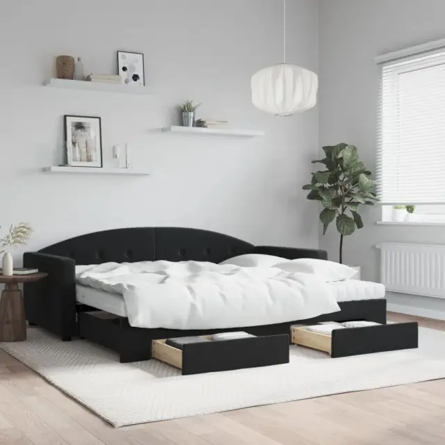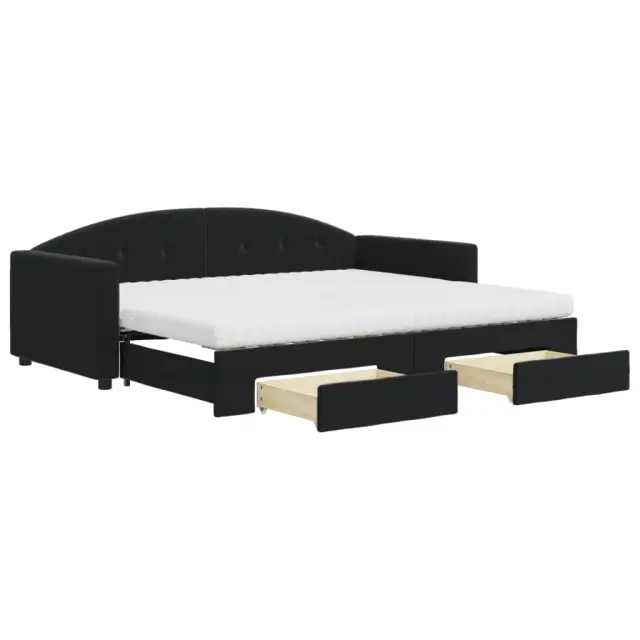 Ta 2 v 1 izvlečna dnevna postelja s predali, ki služi kot kavč in postelja, je praktičen in privlačen dodatek za vašo dnevno sobo ali spalnico. Vsestranska dnevna postelja: Raztegljiva postelja čez dan deluje kot kavč, ponoči pa se z izvlečenim ležiščem zlahka spremeni v zakonsko posteljo, kar je priročna rešitev za sprejemanje gostov in maksimalno povečanje prostora. Veliko prostora za shranjevanje: Ta postelja za goste ima dva predala s kolesi, ki zagotavljata dovolj prostora za shranjevanje oblačil, nogavic, igrač, blazin itd. Udobna penasta vzmetnica: Ta postelja je opremljena z dvema vzmetnicama iz pene za največjo podporo in optimalno udobje. Mehak žamet in trdna konstrukcija: Ta dnevna postelja ima trpežen okvir iz lesa in kovine ter je oblazinjena z mehkim in udobnim žametom.Barva: ČrnaMaterial: Žamet (100 % poliester), kovina, trden les, inženirski lesMaterial letvic: Vezan lesMaterial polnila: Pena Material prevleke vzmetnice: Kosmatena pleteninaDimenzije (neraztegnjena): 222 x 100 x 75 cm (D x Š x V)Dimenzije (raztegnjena): 222 x 192,5 x 75 cm (D x Š x V)Dimenzije vzmetnice iz pene (vsaka): 90 x 200 x 10 cm (Š x D x D)Dimenzije posteljnega predala (vsak): 67 x 50 x 16 cm (D x Š x V)Višina naslonjala za roke, merjena od tal: 58 cmVišina nog: 5 cmPotrebno sestavljanje: DaPaket vsebuje:1 x Izvlečna dnevna postelja 2 x Vzmetnica iz pene2 x Posteljni predal 3197377