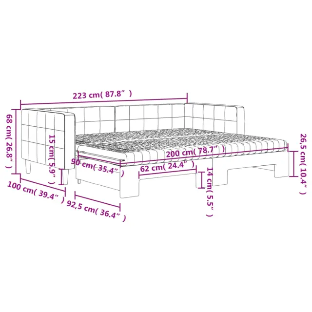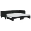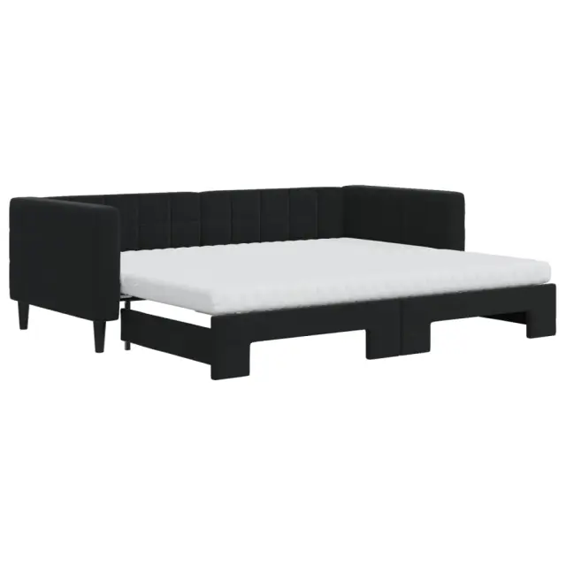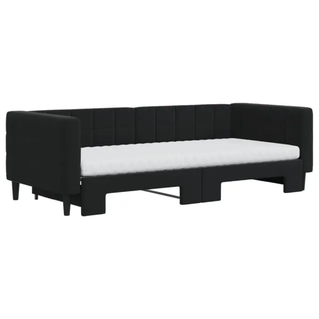 Ta 2 v 1 izvlečna dnevna postelja, ki služi kot kavč in postelja, je praktičen in privlačen dodatek za vašo dnevno sobo ali spalnico. Vsestranska dnevna postelja: Raztegljiva postelja čez dan deluje kot kavč, ponoči pa se z izvlečenim ležiščem zlahka spremeni v zakonsko posteljo, kar je priročna rešitev za sprejemanje gostov in maksimalno povečanje prostora.Udobna penasta vzmetnica: Ta postelja je opremljena z dvema vzmetnicama iz pene za največjo podporo in optimalno udobje.Mehak žamet in trdna konstrukcija: Ta dnevna postelja ima trpežen okvir iz lesa in kovine ter je oblazinjena z mehkim in udobnim žametom.Sodobno oblikovanje: Kavč postelja ima sodoben dizajn, ki ga odlikujejo čiste linije, minimalističen videz in naravna svetloba, vašim notranjim prostorom pa bo dodal sodoben stil!Barva: ČrnaMaterial: Žamet (100% poliester), kovina, trden lesMaterial prevleke vzmetnice: Kosmatena pleteninaMaterial letvic: Vezan lesMaterial polnila: PenaDimenzije (neraztegnjena): 223 x 100 x 68 cm (D x Š x V)Dimenzije (raztegnjena): 223 x 192,5 x 68 cm (D x Š x V)Dimenzije vzmetnice iz pene (vsaka): 90 x 200 x 10 cm (Š x D x V)Višina naslonjal za roke, od tal: 68 cmVišina nog: 15 cmPotrebno sestavljanje: DaPaket vsebuje:1 x Izvlečna dnevna postelja2 x Vzmetnica iz pene 3196719