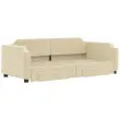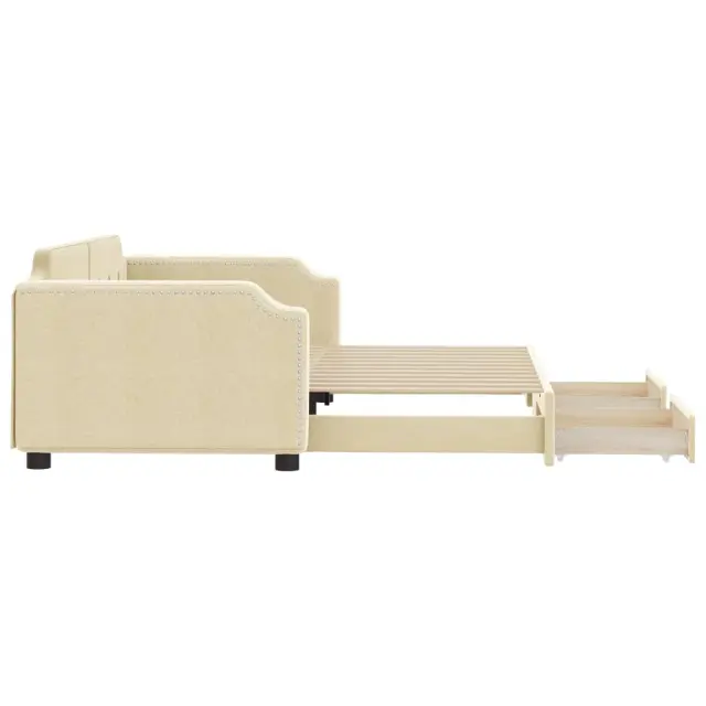 Ta 2 v 1 izvlečna dnevna postelja, ki služi kot kavč in postelja, je praktičen in privlačen dodatek za vašo dnevno sobo ali spalnico. Vsestranska dnevna postelja: Raztegljiva postelja čez dan deluje kot kavč, ponoči pa se z izvlečenim ležiščem zlahka spremeni v zakonsko posteljo, kar je priročna rešitev za sprejemanje gostov in maksimalno povečanje prostora. Veliko prostora za shranjevanje: Ta postelja za goste ima dva predala s kolesi, ki zagotavljata dovolj prostora za shranjevanje oblačil, nogavic, igrač, blazin itd. Vzdržljiva tkanina in trdna konstrukcija: Ta dnevni kavč ima trpežen okvir iz lesa in kovine ter je oblazinjen s trpežno in udobno tkanino. Dobro je vedeti:Vzmetnice niso priložene tej dnevni postelji. Ponujamo različno izbiro ležišč. V naši trgovini si lahko ogledate ustrezne vzmetnice.Barva: Krem Material: Tkanina (100 % poliester), kovina, trden les, inženirski lesMaterial letvic: Vezan les Material polnila: Pena Dimenzije (neraztegnjena): 223 x 110 x 66,5 cm (D x Š x V) Dimenzije (raztegnjena): 223 x 212,5 x 66,5 cm (D x Š x V) Dimenzije posteljnega predala (vsak): 67 x 50 x 16 cm (D x Š x V)Višina naslonjala za roke, merjena od tal: 58 cmVišina nog: 5 cm Velikost primerne vzmetnice: 100 x 200 cm (Š x D) Potrebno: 2 x vzmetnica (ni vključena) Potrebno sestavljanje: DaPaket vsebuje:1 x Izvlečna dnevna postelja 2 x Posteljni predal 3197679
