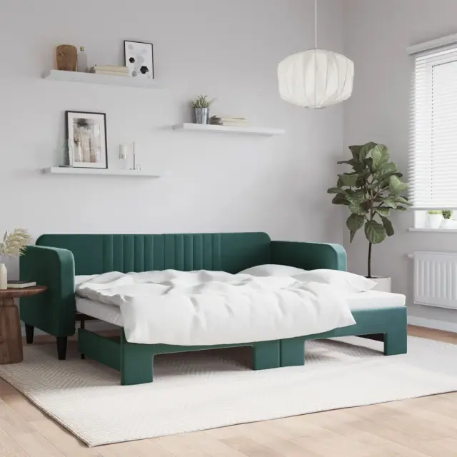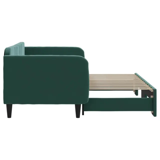 Ta 2 v 1 izvlečna dnevna postelja, ki služi kot kavč in postelja, je praktičen in privlačen dodatek za vašo dnevno sobo ali spalnico. Vsestranska dnevna postelja: Raztegljiva postelja čez dan deluje kot kavč, ponoči pa se z izvlečenim ležiščem zlahka spremeni v zakonsko posteljo, kar je priročna rešitev za sprejemanje gostov in maksimalno povečanje prostora.Mehak žamet in trdna konstrukcija: Ta dnevna postelja ima trpežen okvir iz lesa in kovine ter je oblazinjena z mehkim in udobnim žametom.Sodobno oblikovanje: Kavč postelja ima sodoben dizajn, ki ga odlikujejo čiste linije, minimalističen videz in naravna svetloba, vašim notranjim prostorom pa bo dodal sodoben stil! Dobro je vedeti:Vzmetnice niso priložene tej postelji. Ponujamo različno izbiro ležišč. V naši trgovini si lahko ogledate ustrezne vzmetnice.Barva: Temno zelenaMaterial: Žamet (100% poliester), kovina, trden lesMaterial letvic: Vezan lesMaterial polnila: PenaDimenzije (neraztegnjena): 223 x 100 x 75 cm (D x Š x V)Dimenzije (raztegnjena): 223 x 192,5 x 75 cm (D x Š x V)Višina naslonjal za roke, od tal: 68 cmVišina nog: 15 cmVelikost primerne vzmetnice: 90 x 200 cm (Š x D)Potrebno: 2 x vzmetnica (ni vključena)Potrebno sestavljanje: Da 3197065