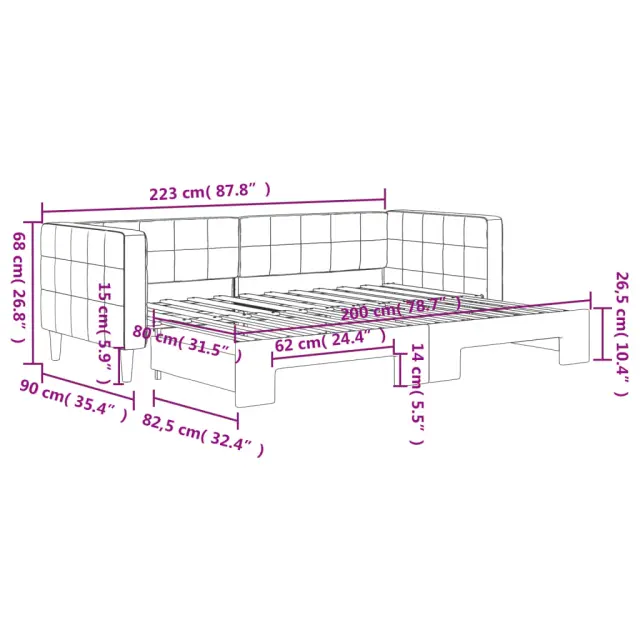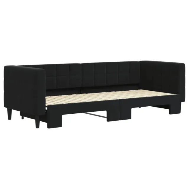 Ta 2 v 1 izvlečna dnevna postelja, ki služi kot kavč in postelja, je praktičen in privlačen dodatek za vašo dnevno sobo ali spalnico. Vsestranska dnevna postelja: Raztegljiva postelja čez dan deluje kot kavč, ponoči pa se z izvlečenim ležiščem zlahka spremeni v zakonsko posteljo, kar je priročna rešitev za sprejemanje gostov in maksimalno povečanje prostora.Mehak žamet in trdna konstrukcija: Ta dnevna postelja ima trpežen okvir iz lesa in kovine ter je oblazinjena z mehkim in udobnim žametom.Sodobno oblikovanje: Kavč postelja ima sodoben dizajn, ki ga odlikujejo čiste linije, minimalističen videz in naravna svetloba, vašim notranjim prostorom pa bo dodal sodoben stil! Dobro je vedeti:Vzmetnice niso priložene tej postelji. Ponujamo različno izbiro ležišč. V naši trgovini si lahko ogledate ustrezne vzmetnice.Barva: ČrnaMaterial: Žamet (100% poliester), kovina, trden lesMaterial letvic: Vezan lesMaterial polnila: PenaDimenzije (neraztegnjena): 223 x 90 x 68 cm (D x Š x V)Dimenzije (raztegnjena): 223 x 172,5 x 68 cm (D x Š x V)Višina naslonjal za roke, od tal: 68 cmVišina nog: 15 cmPrimerna velikost vzmetnice: 80 x 200 cm (Š x D)Potrebno: 2 x vzmetnica (ni vključena)Potrebno sestavljanje: Da 3196688