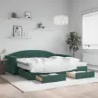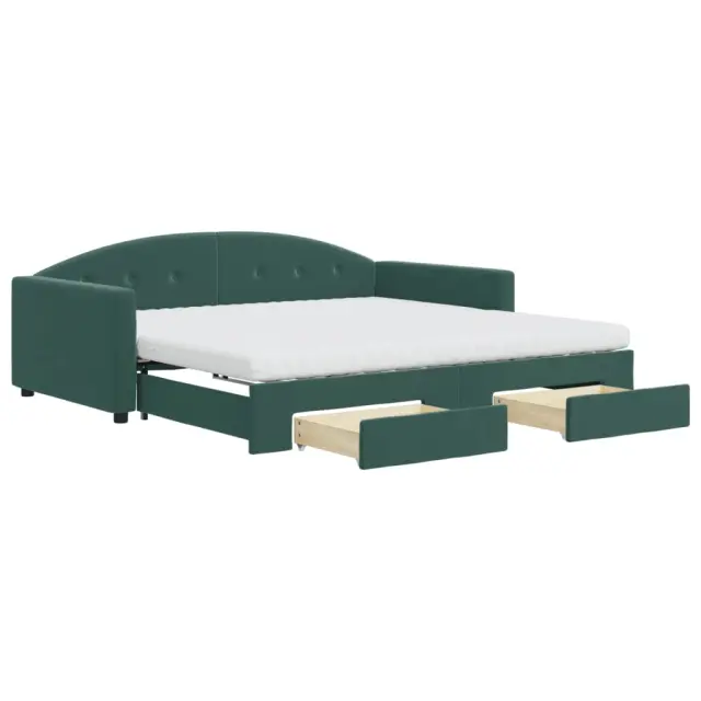 Ta 2 v 1 izvlečna dnevna postelja s predali, ki služi kot kavč in postelja, je praktičen in privlačen dodatek za vašo dnevno sobo ali spalnico. Vsestranska dnevna postelja: Raztegljiva postelja čez dan deluje kot kavč, ponoči pa se z izvlečenim ležiščem zlahka spremeni v zakonsko posteljo, kar je priročna rešitev za sprejemanje gostov in maksimalno povečanje prostora. Veliko prostora za shranjevanje: Ta postelja za goste ima dva predala s kolesi, ki zagotavljata dovolj prostora za shranjevanje oblačil, nogavic, igrač, blazin itd. Udobna penasta vzmetnica: Ta postelja je opremljena z dvema vzmetnicama iz pene za največjo podporo in optimalno udobje. Mehak žamet in trdna konstrukcija: Ta dnevna postelja ima trpežen okvir iz lesa in kovine ter je oblazinjena z mehkim in udobnim žametom.Barva: Temno zelenaMaterial: Žamet (100 % poliester), kovina, trden les, inženirski lesMaterial letvic: Vezan lesMaterial polnila: Pena Material prevleke vzmetnice: Kosmatena pleteninaDimenzije (raztegnjena): 222 x 110 x 75 cm (D x Š x V)Dimenzije (raztegnjena): 222 x 212,5 x 75 cm (D x Š x V)Dimenzije vzmetnice iz pene (vsaka): 100 x 200 x 10 cm (Š x D x D)Dimenzije posteljnega predala (vsak): 67 x 50 x 16 cm (D x Š x V)Višina naslonjala za roke, merjena od tal: 58 cmVišina nog: 5 cmPotrebno sestavljanje: DaPaket vsebuje:1 x Izvlečna dnevna postelja 2 x Vzmetnica iz pene2 x Posteljni predal 3197382